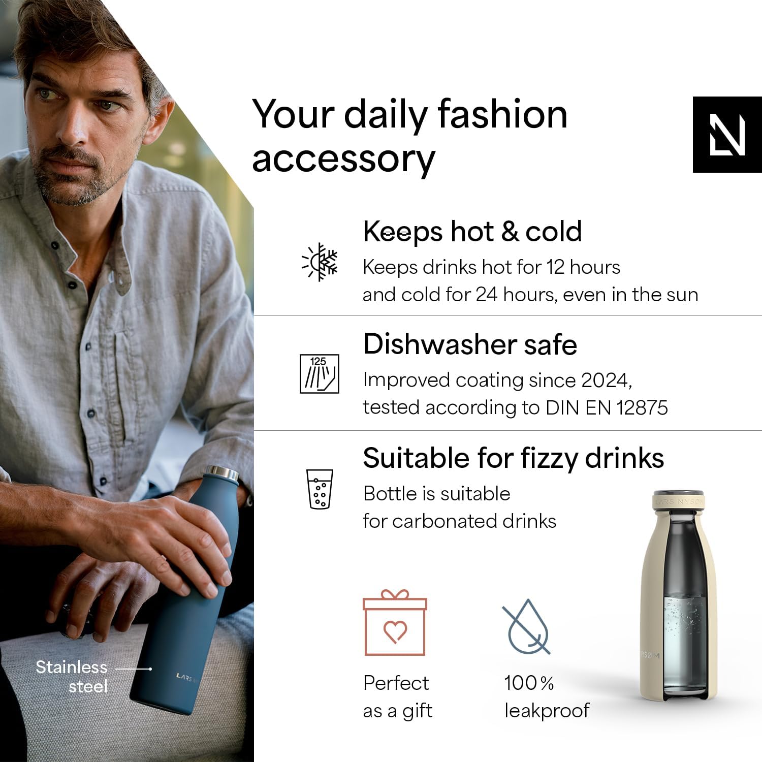 - IDEAL GIFT: The water bottle is perfect as a gift for Christmas. The sports bottle is made of high-quality 18/8 Stainless-Steel and is ideal for carbonated drinks, water and juices.