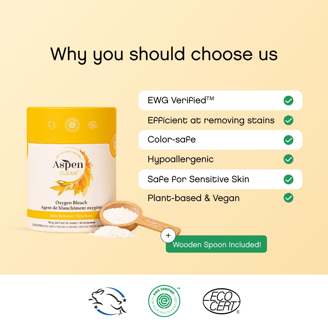 - No harsh chemicals & hypoallergenic: The Aspen Clean oxygen bleach laundry powder removes any kind of clothing stain but is still gentle on skin and doesn’t use harsh chemicals or toxins. They are certified by EcoCert.