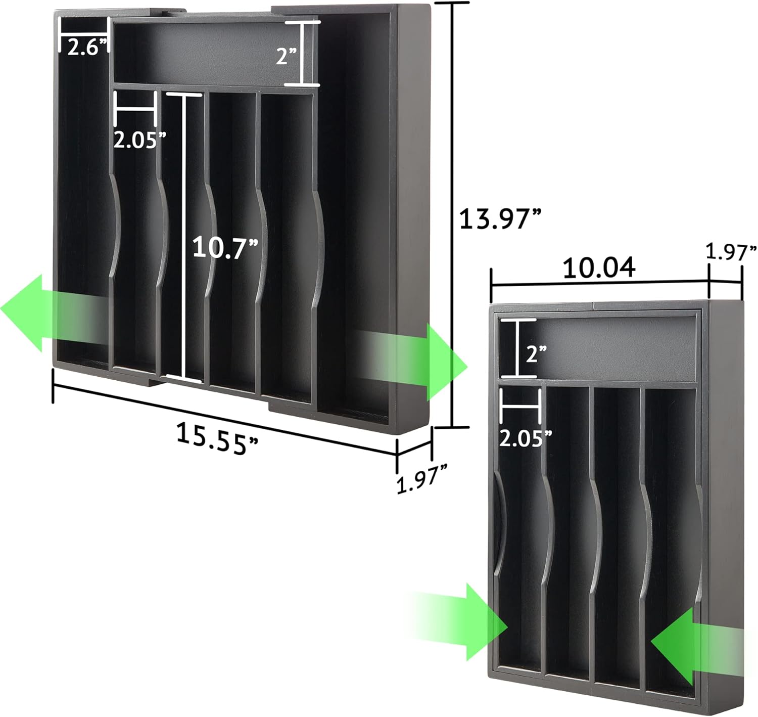 - [START YOUR KITCHEN ORGANIZATION]: The 10.04" - 15.5" wide, 13.98" long and 1.97" deep bamboo drawer organizer can tame your out-of-control kitchen drawers, to store and organize the cutlery and kitchen utensils according to your rules, and maximize the drawer storage. Keep everything accessible and organized, so that you don't have to rifle around for your cooking tools. Beautiful and practical kitchen drawer organizer turns the cooking and tasting into things of beauty and efficiency.