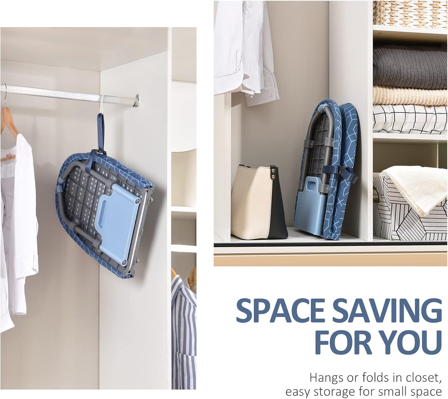 - INTIMATE DETAILS- The compact ironing board can be fastened by locking buttons when folded. With its own hanging hook, it can be mounted onto a wall or door, making it really easy to store.