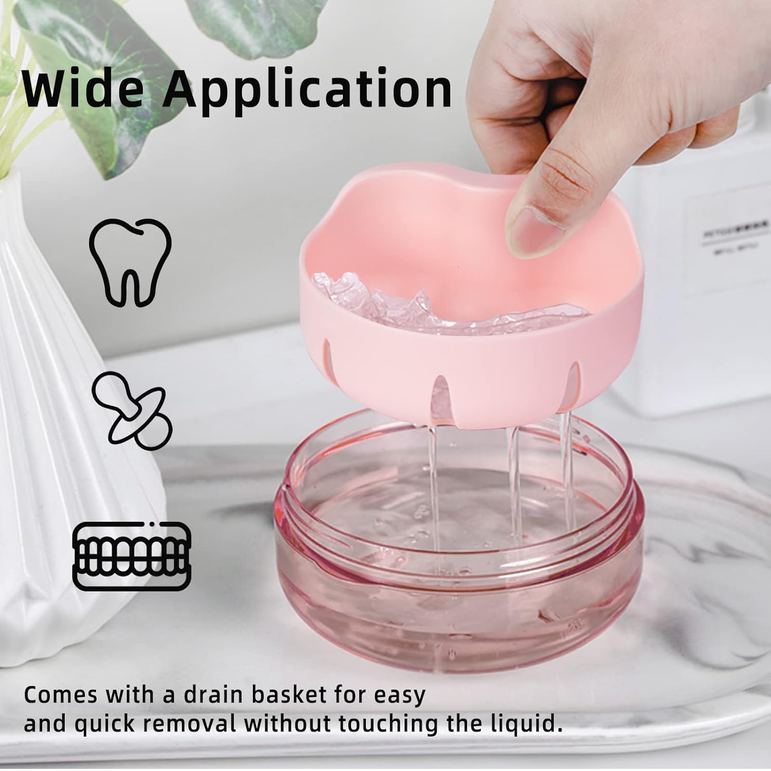 - Wide Application:This denture cup has a little drain basket to separate denture and tray,keeping your dentures or retainer clean and hygienic at all times.Mouth-guard case is perfect for clear braces,mouth guard,baby-pacifier,or storing small items.