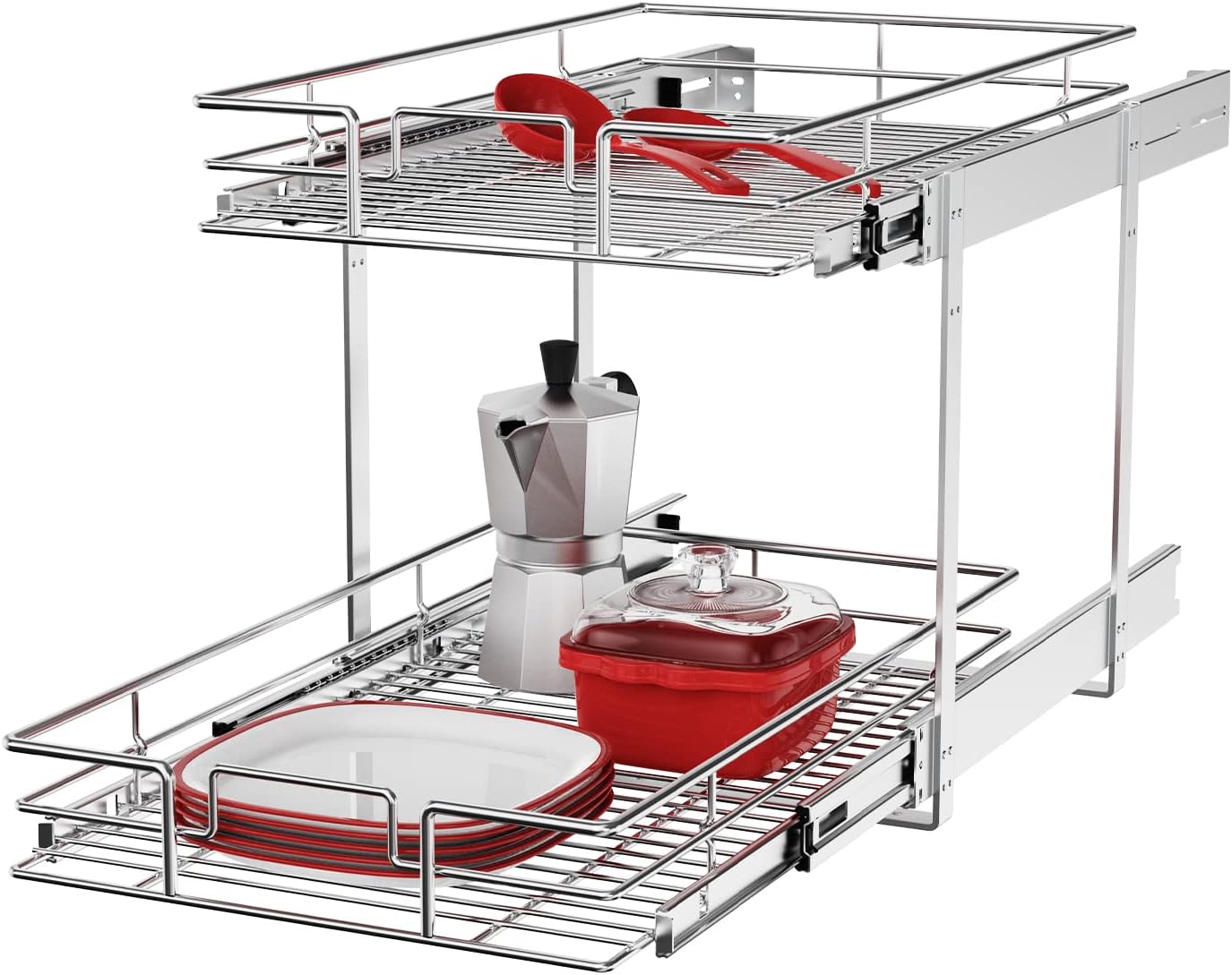 - ăSpace-saving Pull Out Cabinet OrganizerăThis slide out cabinet organizer can maximize your cabinet space. Makes it super easy to store, organize, and access your stand mixers, pots, pans, baking sheets and other kitchen accessories, cleaning supplies, and various odds and ends. Now your cabinet is no longer just stacks of potspans.