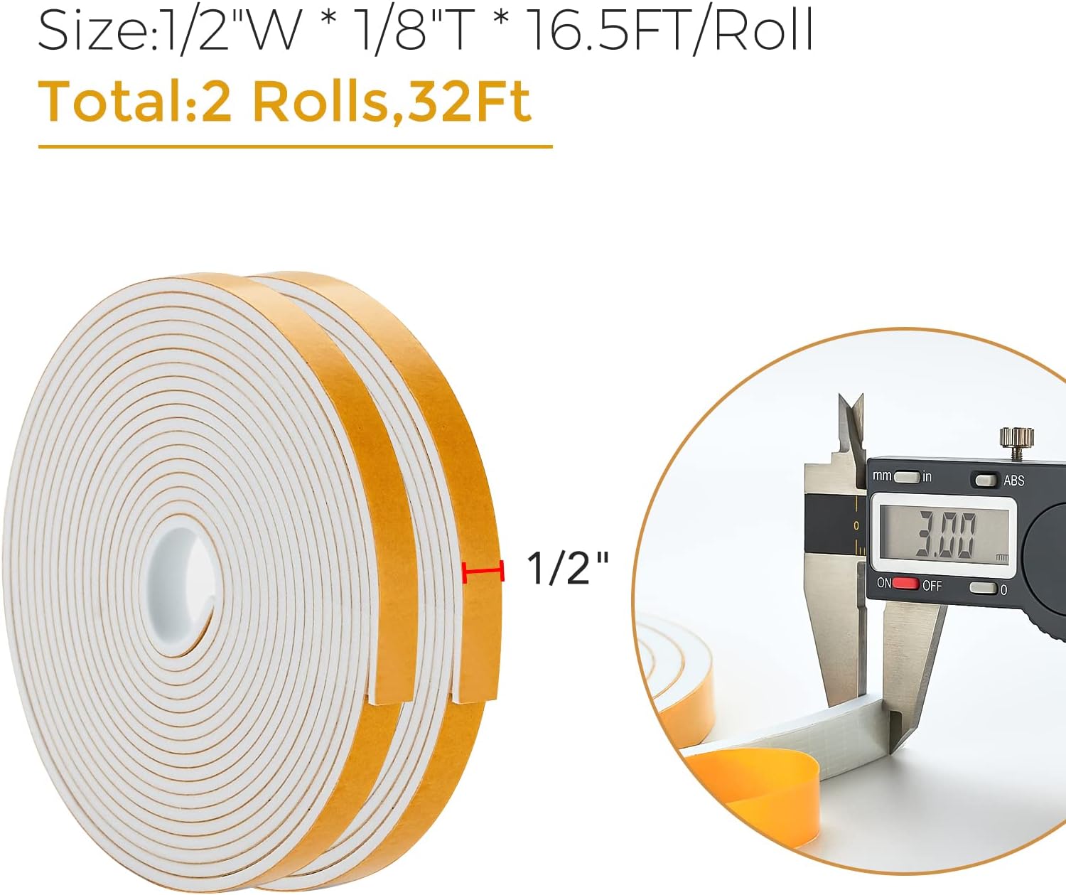 32 Feet Weather Stripping Door Seal, 1/2" Wide X 1/8" Thick Door Seal Strip High Density Foam Tape Adhesive Strip for Door Soundproofing,Window Insulation (1/2" x 1/8" x 32FT,White)