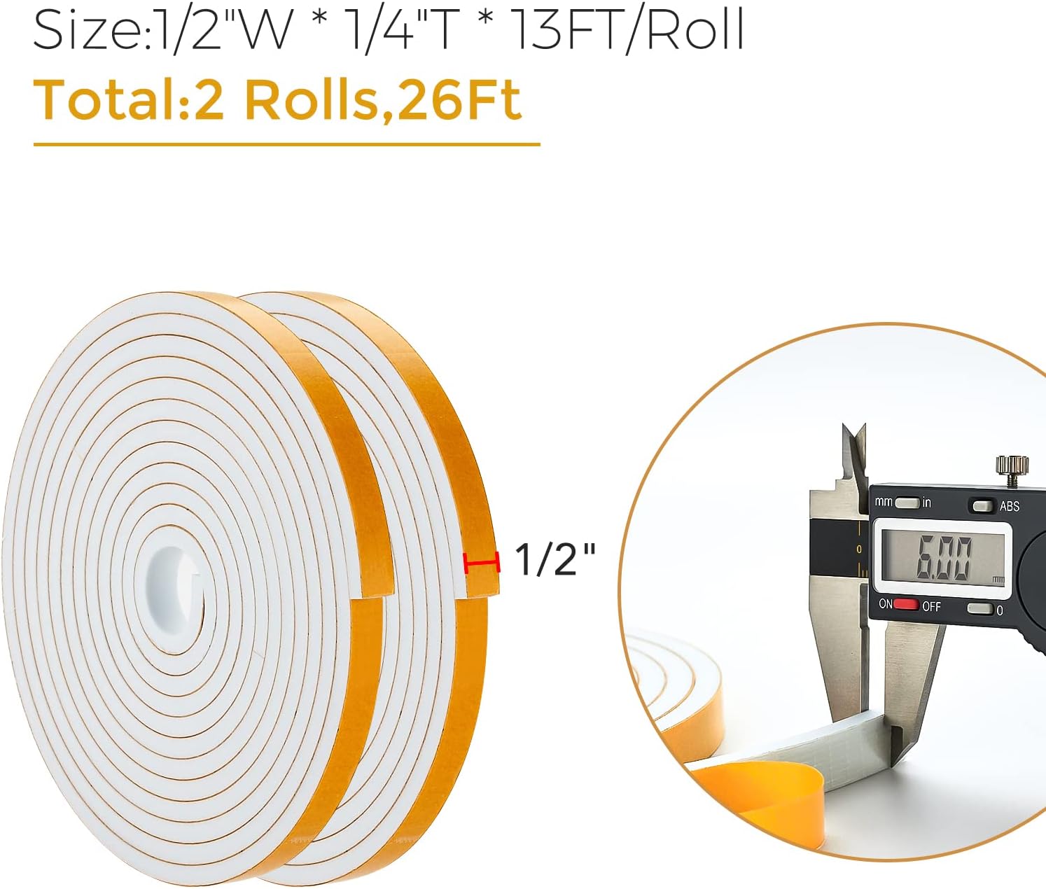 26 Feet Weather Stripping Door Seal, 1/2" Wide X 1/4" Thick Door Seal Strip High Density Foam Tape Adhesive Strip for Door Soundproofing,Window Insulation (1/2" x 1/4" x 26FT,White)
