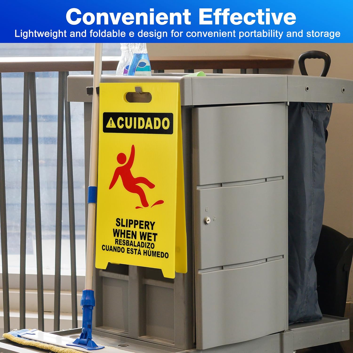 - Fold-out Design - The caution sign features a built-in carrying handle and fold down for convenient portability and storage. Our wet floor signs are easy to fold flat to 1 inch ,which can fit on the most janitor carts and cleaning carts for transportation.