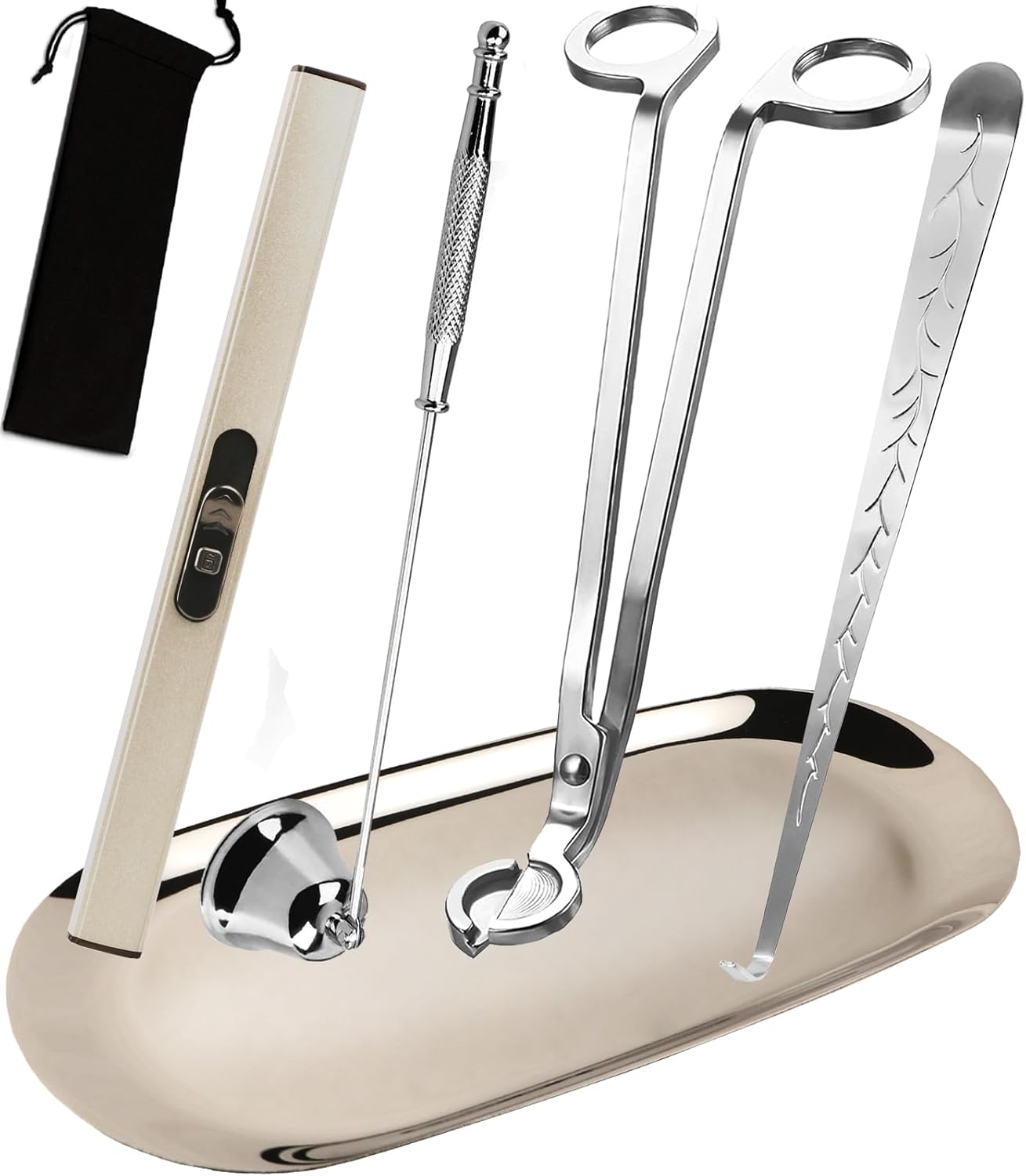 - 6IN1 Candle Accessory Set: The upgrade set includes a Rechargeable Lighter with USB Cable, Storage Tray, Candle Wick Trimmer and Candle Wick Dipper and Candle Snuffer, Portable Storage Bag. Not only the perfect gift for scented candle lovers, but also perfect for fire pits, grills, camping, hiking, fireworks, outdoor and indoor activities, and more to protect you and your family from burns.