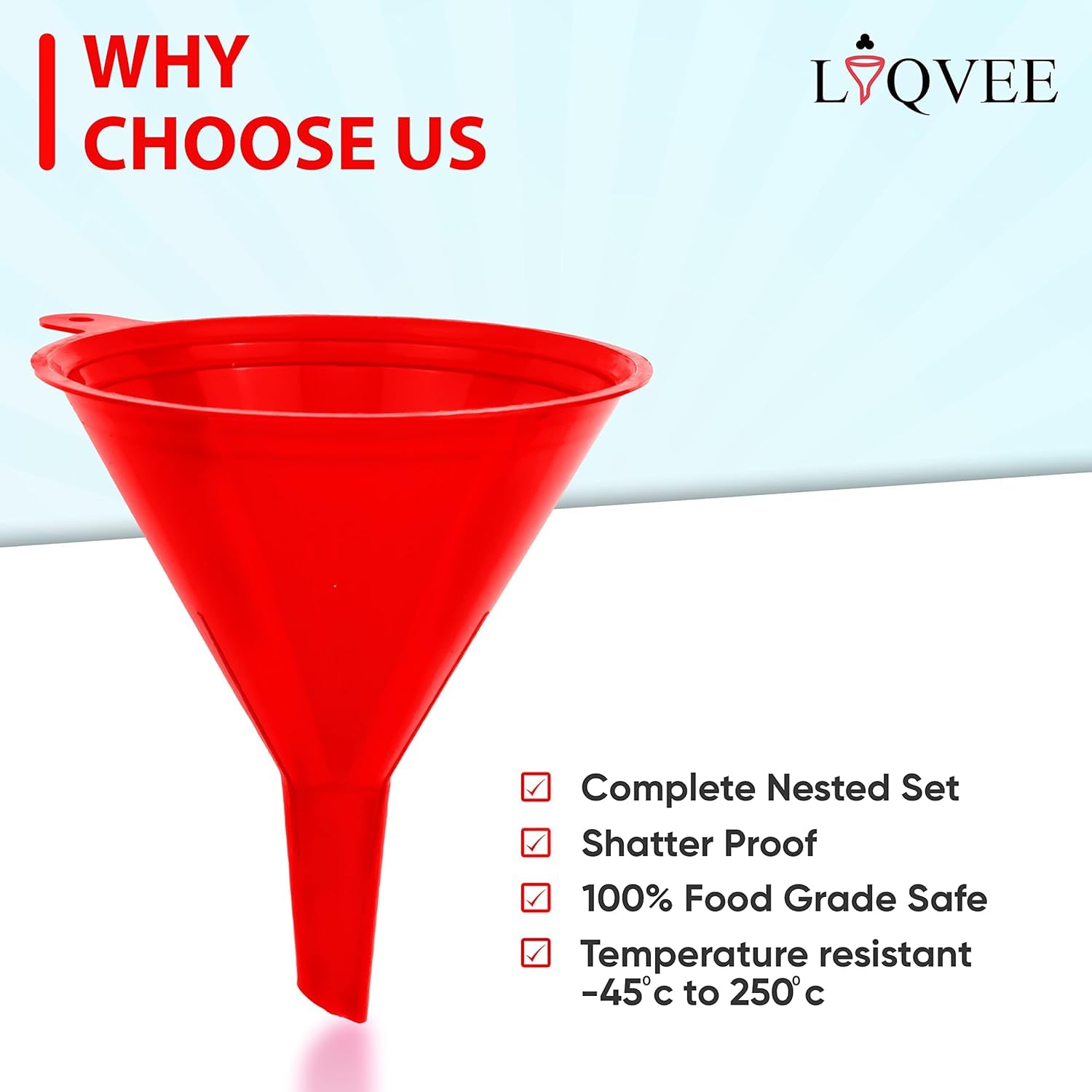 - *Space-Saving Design:* Our kitchen funnel set is designed to save space. The colorful, stackable design ensures easy storage, making it ideal for small kitchens and garages. Keep your plastic funnels handy for any kitchen or automotive use.