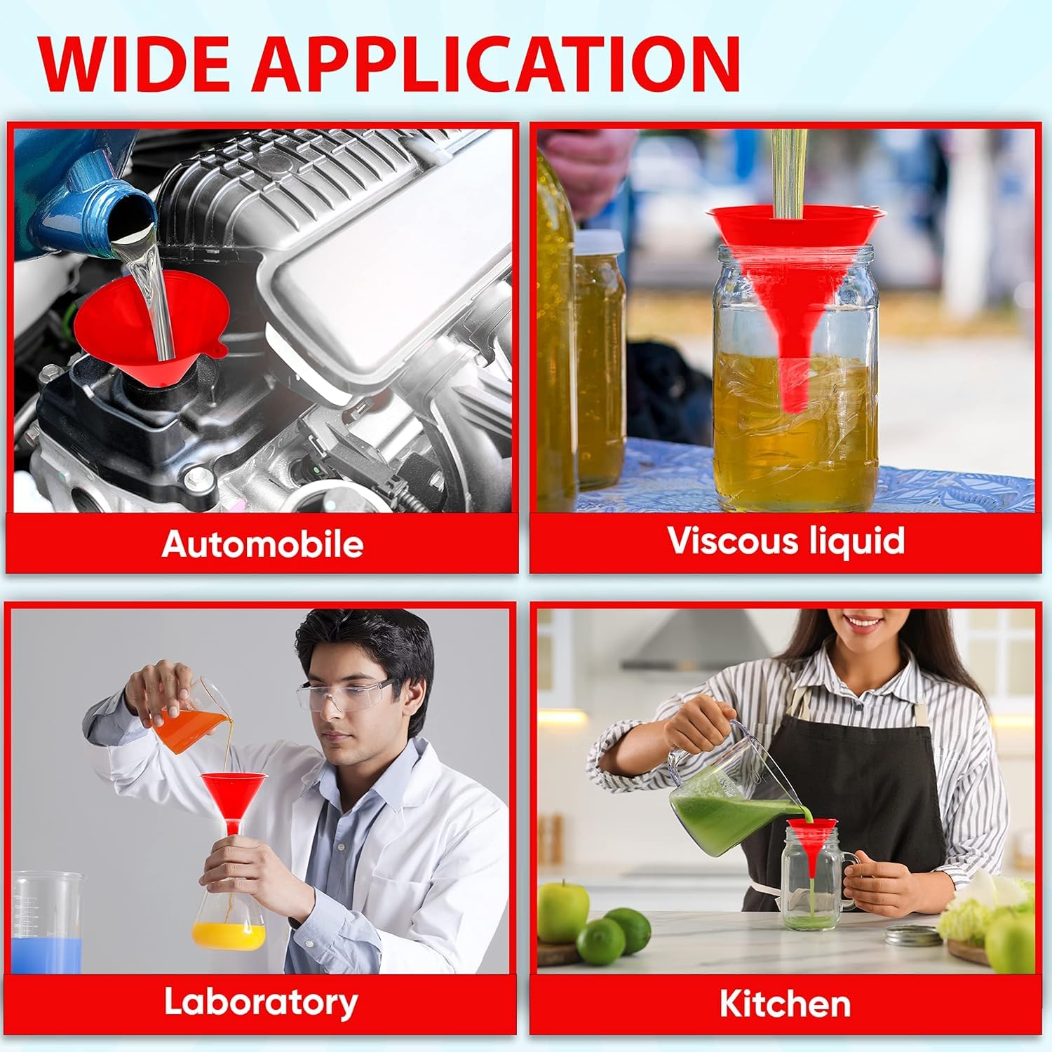 - *4-Pack Set with Sizes:* Our funnel set includes four sizes (122mm, 101mm, 76mm, and 50mm), perfect for all your pouring needs. Whether you need an oil funnel or a kitchen funnel, these small funnels for filling small bottles make every task easier.