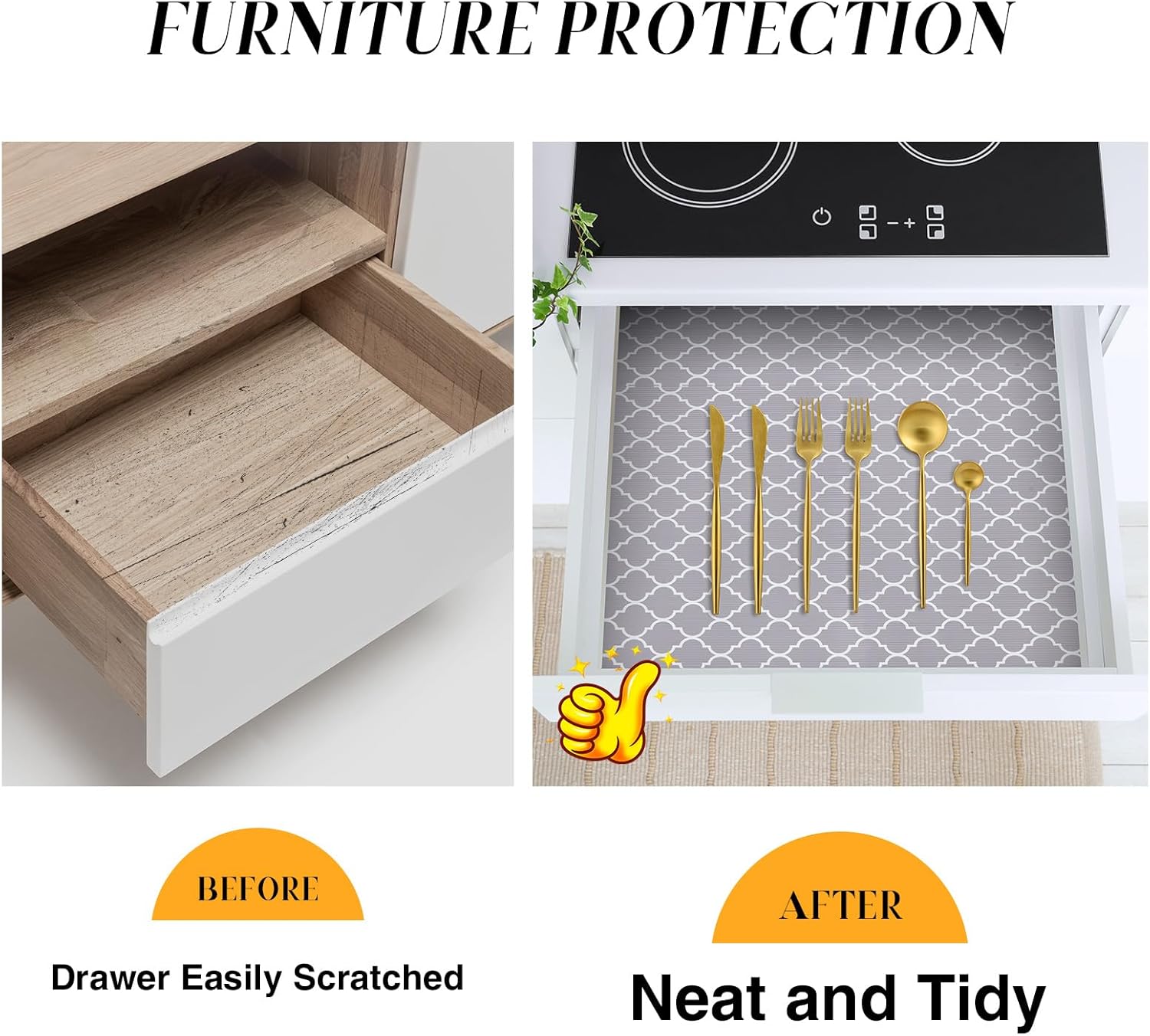 - π PREMIUM FOOD-GRADE DRAWER LINERS FOR KITCHEN- This kitchen shelf liner is made of BPA-free, odor-free, and eco-friendly EVA material for your safety. The non-slip bottom of this drawer liners for kitchen allows your kitchen supplies to stay organized, in place and on the shelves, wire rack and pantry.