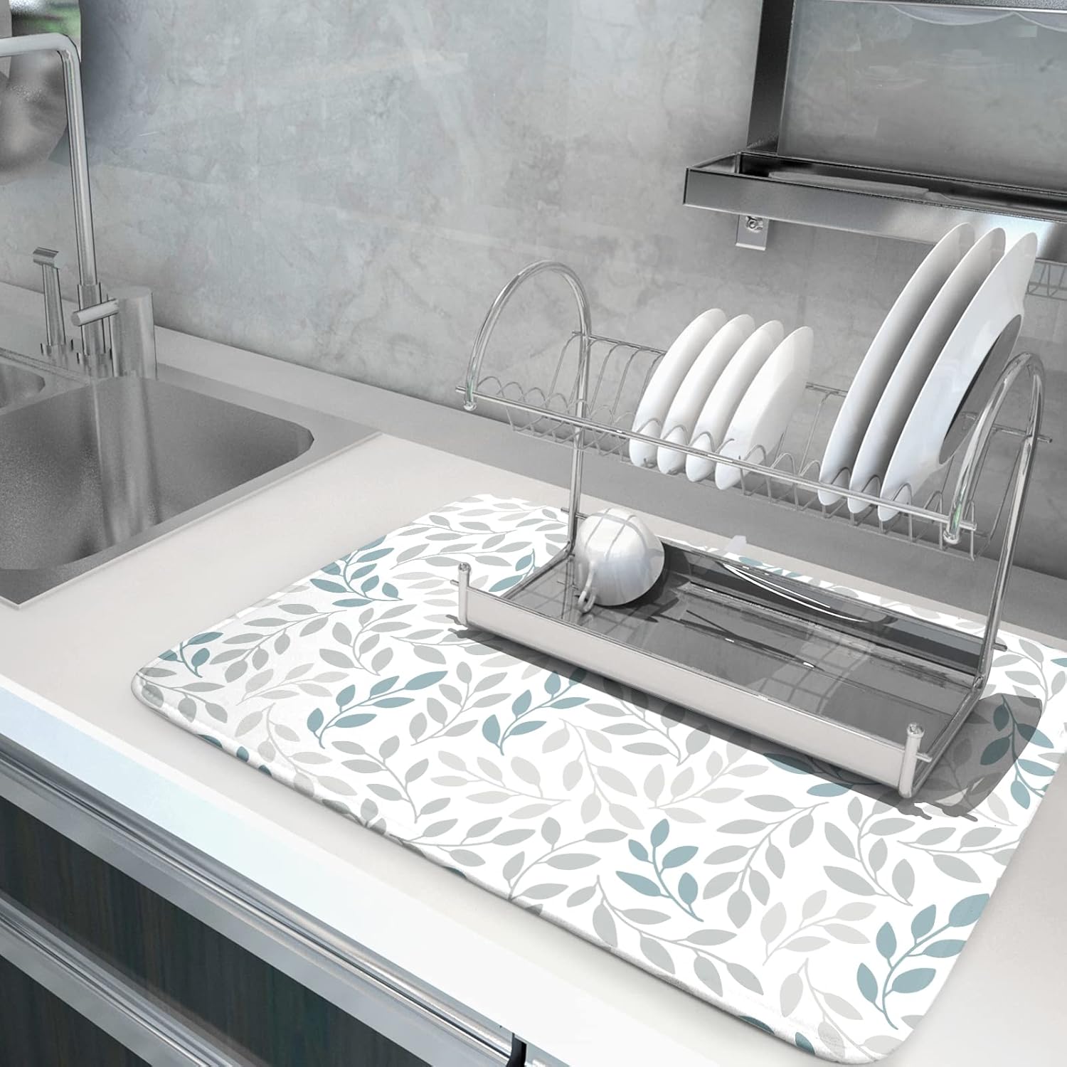 Leaves Branches Dish Drying Mat 18x24 for Kitchen Counter Decor Grey and Blue Leaf Absorbent Reversible Plant Dish Mat Microfiber Drying Pad Dish Drainer Rack Mats for Coffee Bar Home Decor