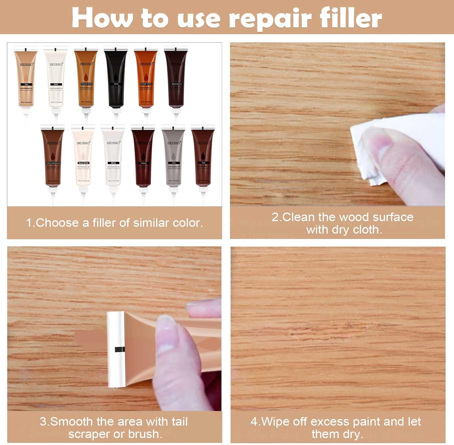 - Easy to Use:Our floor repair kit is made of high-quality formula materials,it can easily and tightly blend with the furniture surface,dry quickly and last permanently.Simply apply the wood filler to where needed with brush,then scrape off the excess with a scraper and just let is dry naturally.And wood markers can be used to touch up the superficial scratches or to draw wood grain.