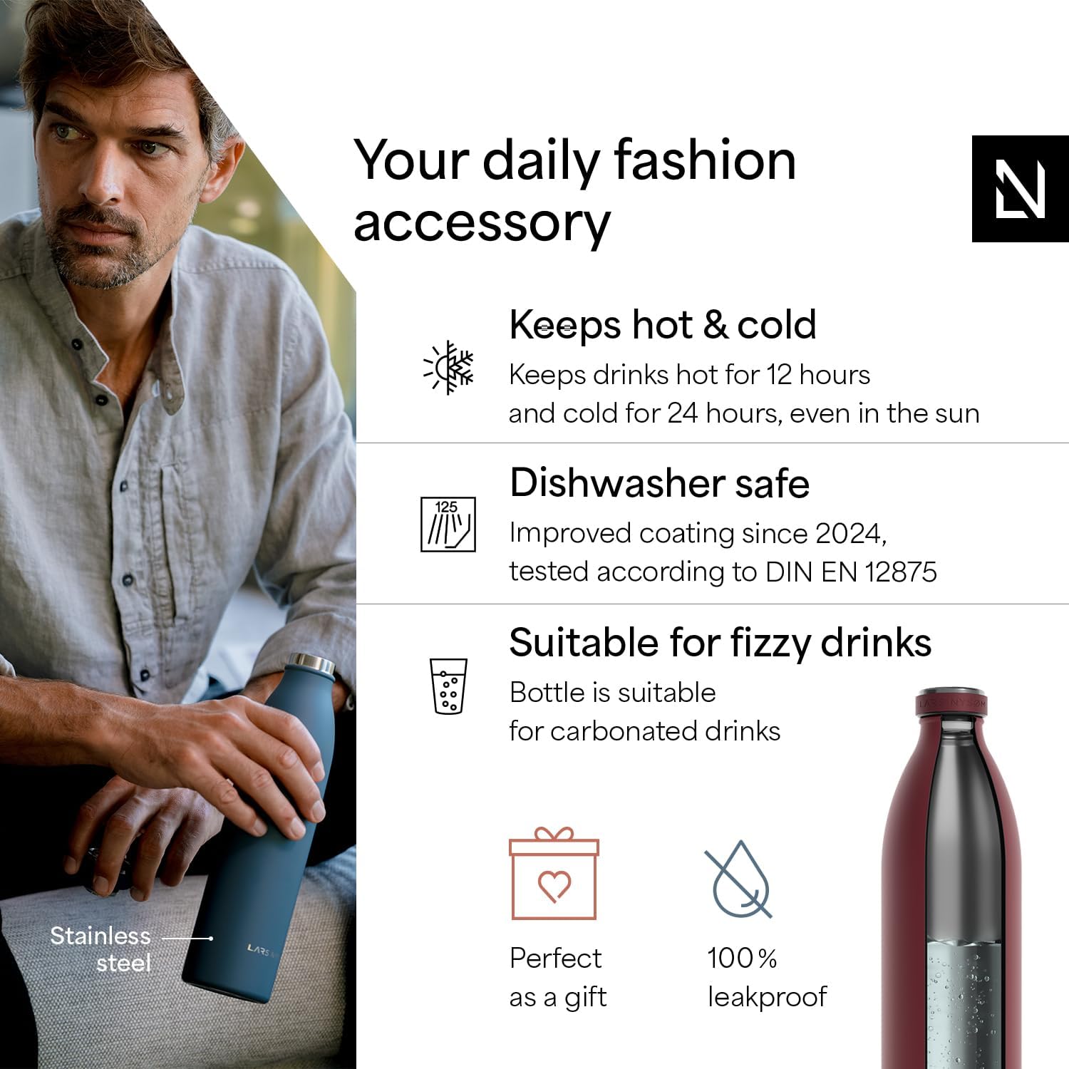 - IDEAL GIFT: The water bottle is perfect as a gift for Christmas. The sports bottle is made of high-quality 18/8 Stainless-Steel and is ideal for carbonated drinks, water and juices.