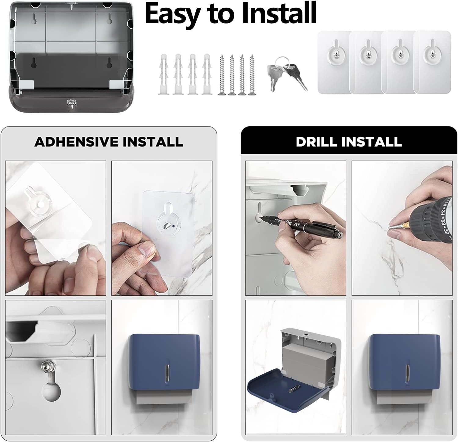 Paper Towel Dispenser Wall Mount,Capacity 200+ Sheets ZFold Tri Fold Blue Adhesive No Drilling or Screws Installation for Home Toilet