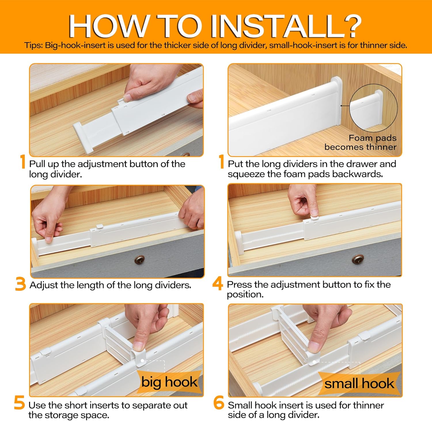 - Long Lasting & Stable Grip: To ensure the most lasting stability of the dividers, we adopt the serrated design to fix instead of the spring structure on the market. So there is a pull tab on the long divier which need to be pushed from the bottom to the top with our thumb. There are also foam pieces covered on kitchen drawer dividers that are a nice touch for grip. Protect the drawer from scratches, leaving no traces or residues