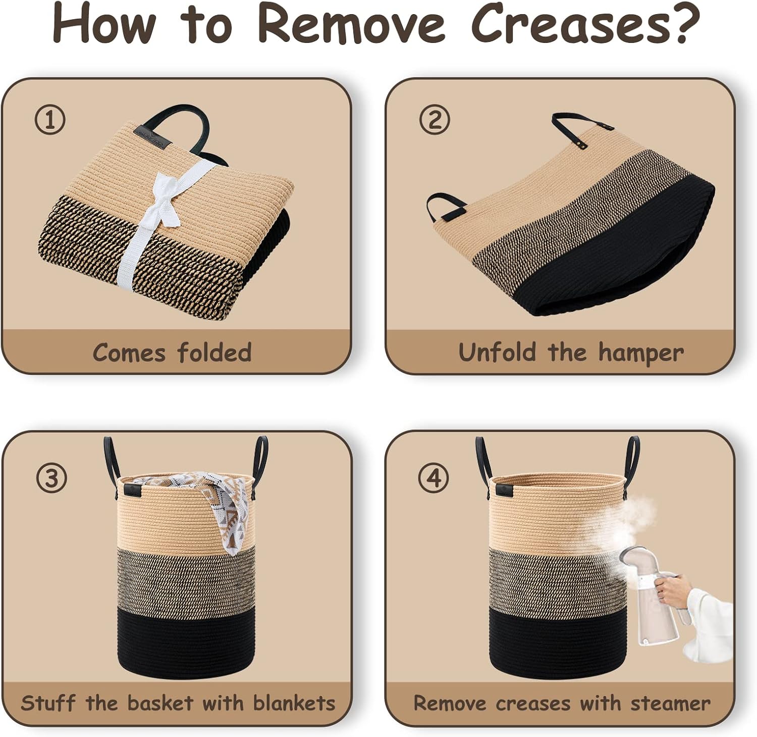 - ❤【WAY TO RESTORE ELEGANT SHAPE】 Our collapsible baskets are folded during shipping. Please fill the hamper with clothes or blankets for a period of time. If you want to remove creases from the surface of the tall basket, you can use a steamer.