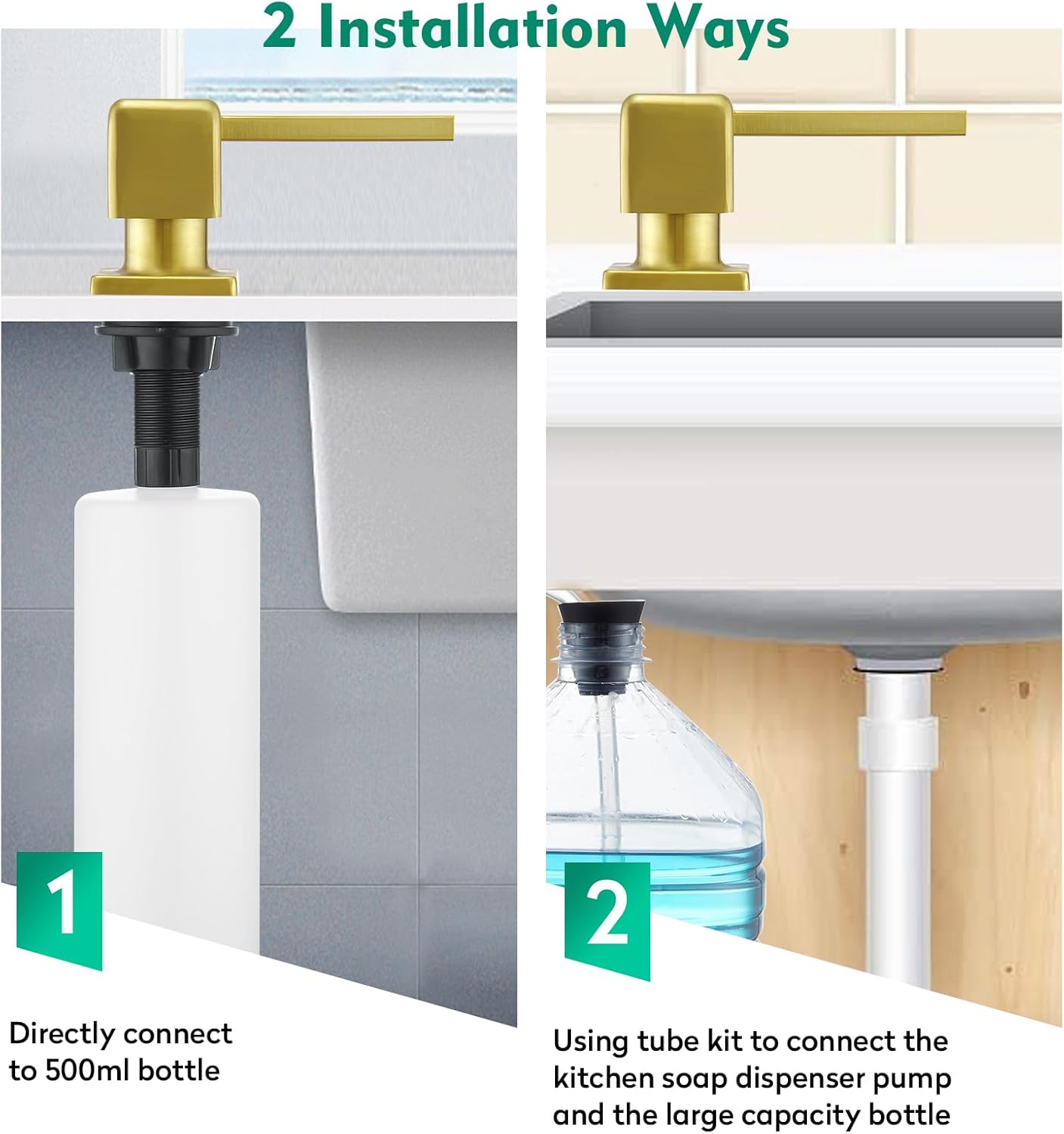 - 💧【FAST AND EASY INSTALLATION】 The kitchen soap dispenser comes with detailed instructions. You can install this kitchen sink soap dispenser on the sink or countertop in a few minutes. Even for lay people, just connect with extension tube kit,use the big bottle directly, skipping the messy for refilling.Then enjoy your new soap dispenser.
