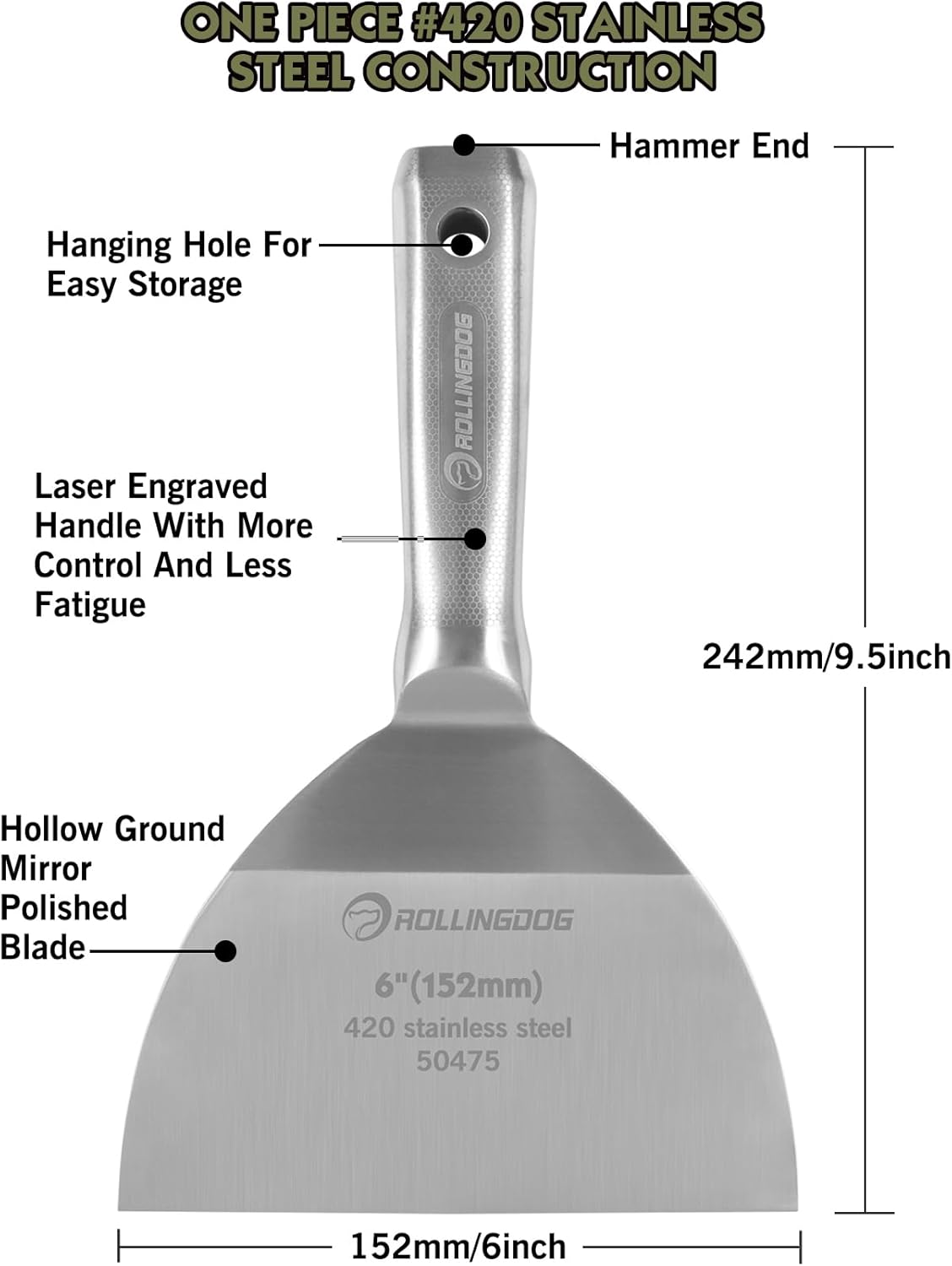 ROLLINGDOG 6 inch Putty Knife - 420 Stainless Steel Spackle Knife Drywall Knife One Piece Mirror Polished Blade for Scraping Paint, Taping