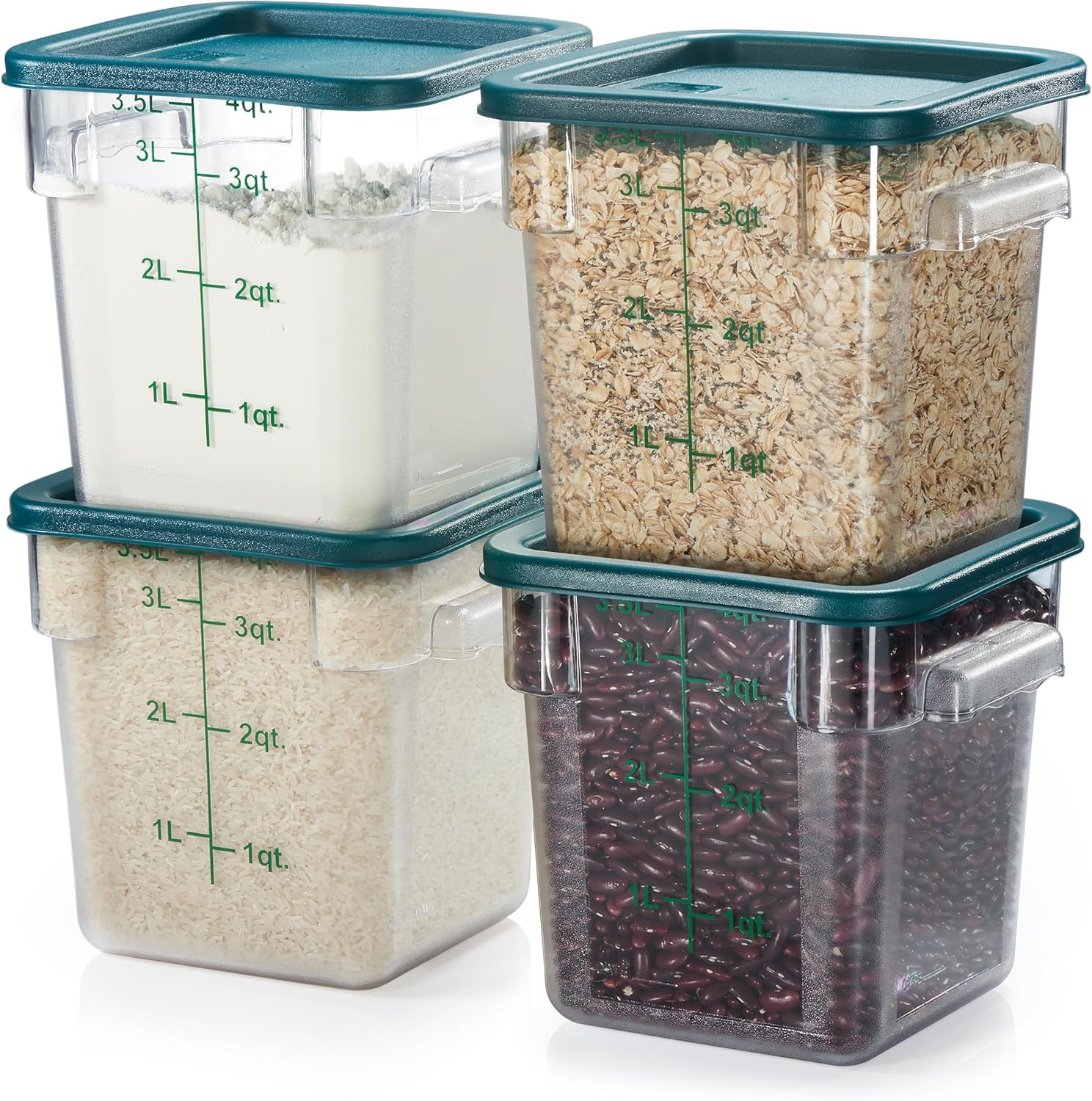 CURTA 4 Pack Food Storage Container with Green Lid - NSF Commercial Grade in 4.0 Qt - Square, Clear, Polycarbonate