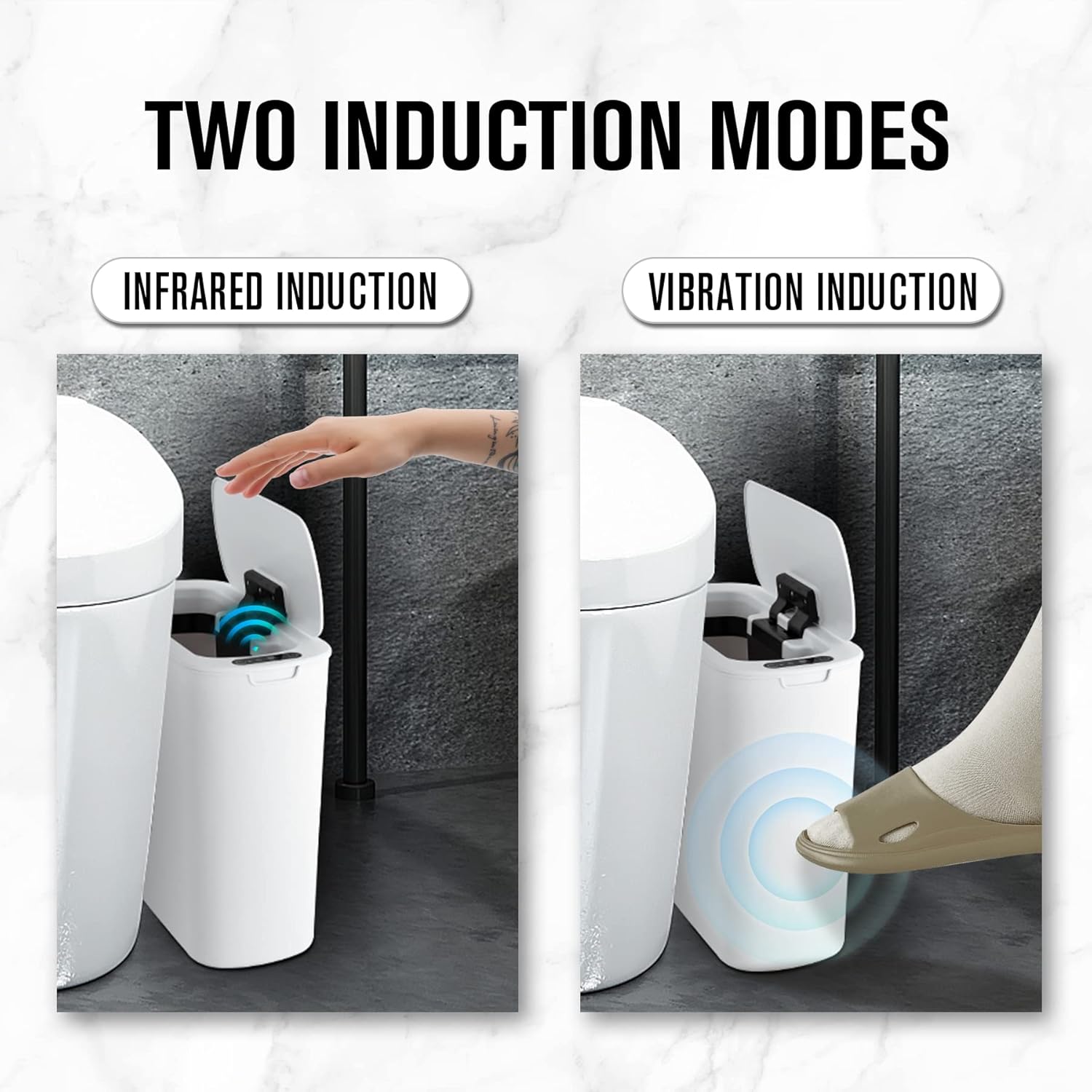 - Touchless Trash Can: Automatic infrared sensing technology, when your hand or any object over the sensing area, the lid will open, touchless mode is more hygienic. Those with mobility problems may find the automatic feature more convenient than foot operated models. Requires 2 AA batteries (not included)
