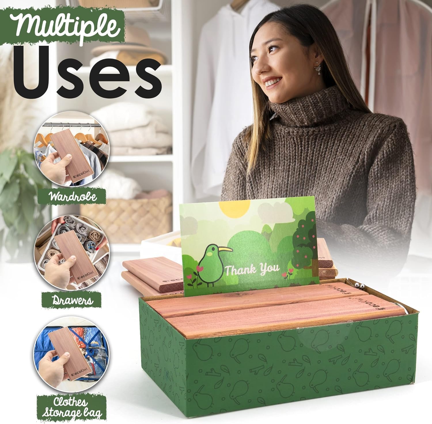 - PROTECT OUR PRECIOUS PLANET - At ecoKiwi, we were tired of seeing excess waste and unsustainable products, so we created our cedar planks for closets to be long-lasting and sustainably sourced. Our cedar closet hangers eliminate the need for any chemicals or plastics to be used. Just pure, sustainable and effective eastern red cedar chips for storage. Join the eco friendly revolution with our cedar blocks for closet products.