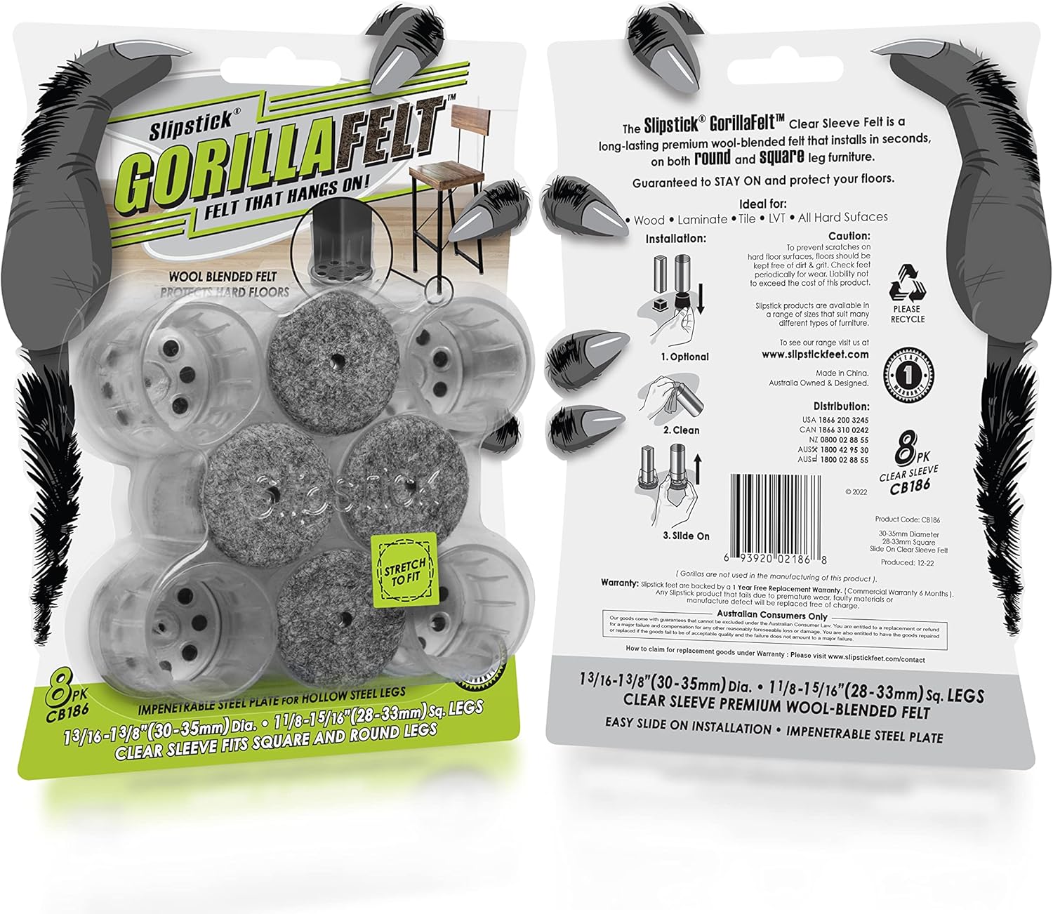 Slipstick GorillaFelt Chair Leg Floor Protectors for Hardwood Floors, Clear Sleeve Felt Pads for Furniture That Stay On, Fits Round & Square Legs, Includes 8 Premium Transparent Chair Socks, CB186