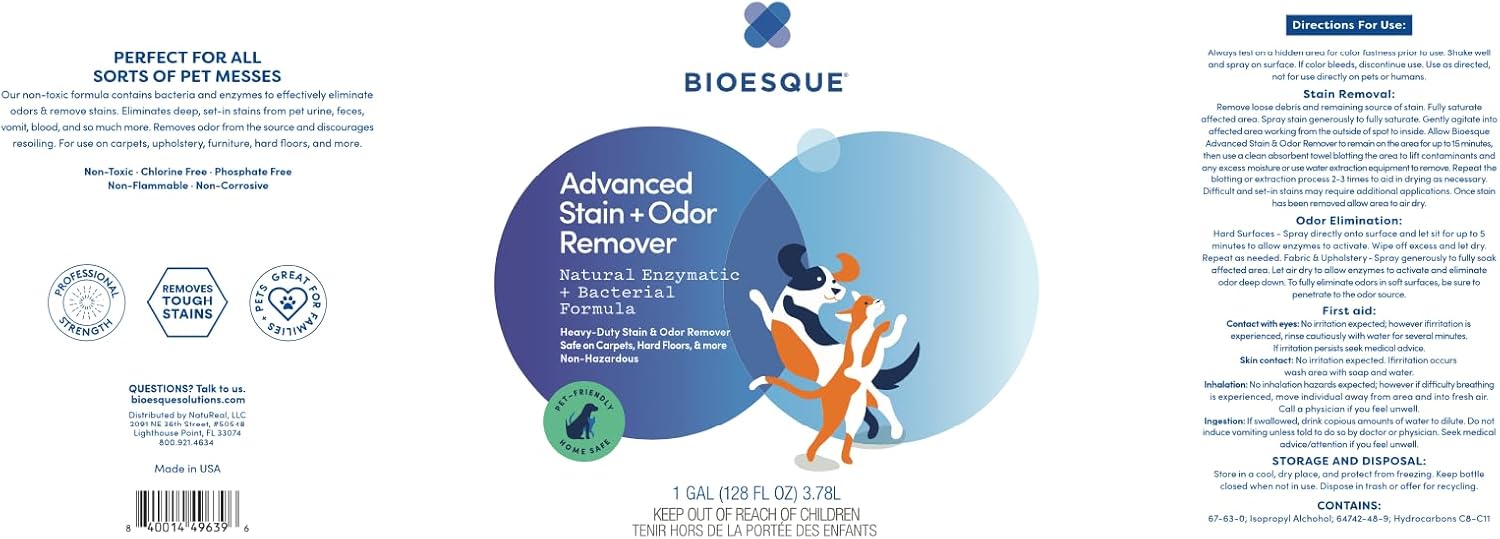 Bioesque Advanced Stain + Odor Remover, Pet-Friendly Natural Enzymatic & Bacterial Formula, Heavy-Duty Stain & Odor Remover, Safe on Carpets, Hard Floors, & More, 1 Gallon (Pack of 1)