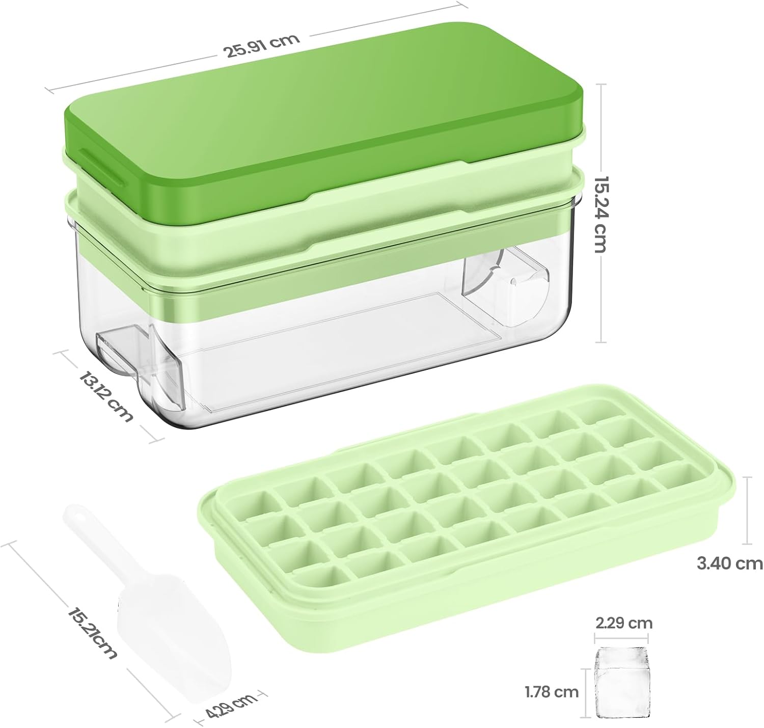 - Saving Space:Ice tray can be stacked and stored to save space. Contains: 2*32-pcs ice cube tray,ice scoop, lid, pillar plate, and ice cube storage bin that holds nearly 120 ice cubes.Size: 10.2 x 5.1 x 5.7"