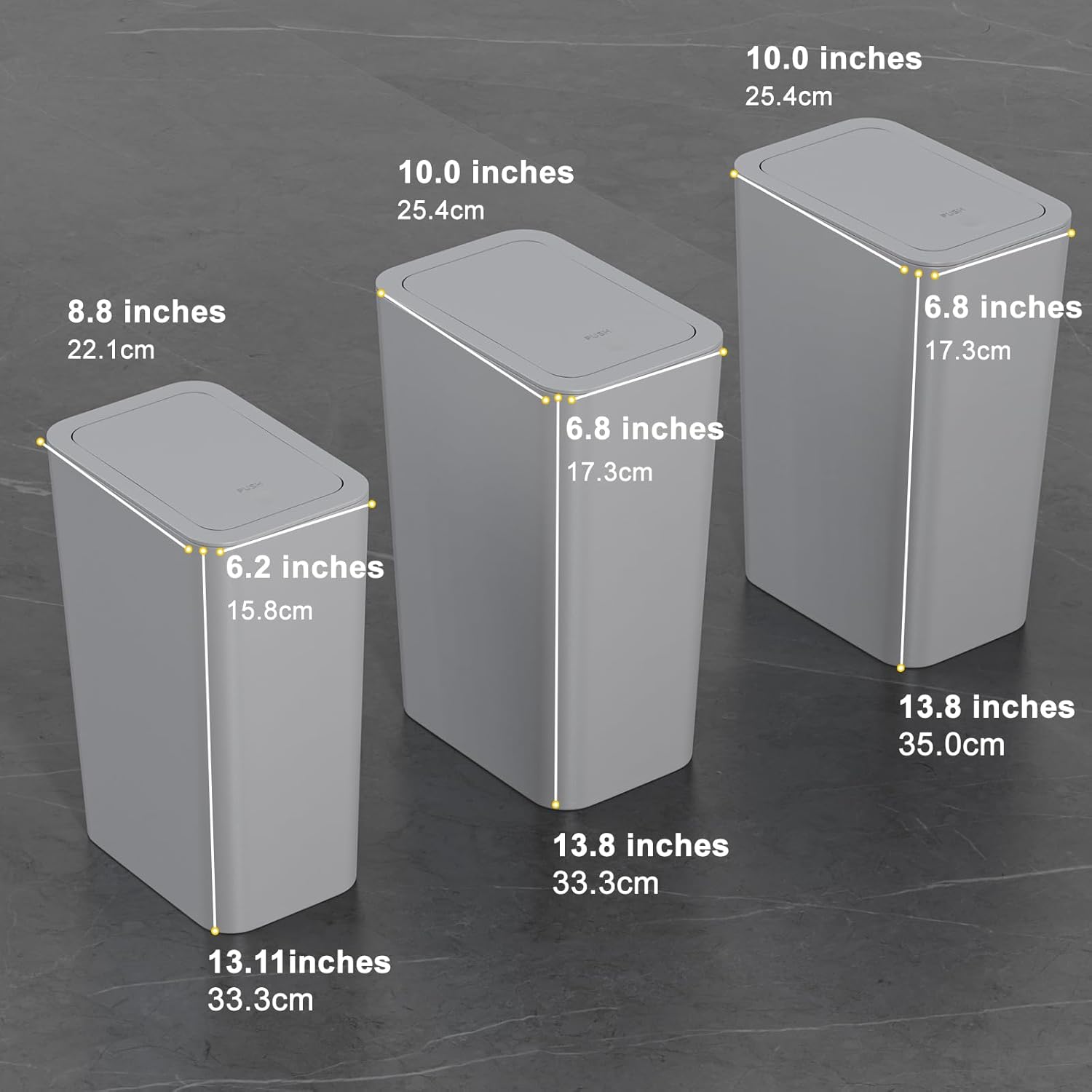 - Modern Look and Space-Saving Small Garbage Can: This kitchen garbage can with lid has slim design, it takes up very little space, making them great for small bathrooms and kitchens whereas small waste basket for bathroom is large enough to hold plenty of garbage and debris. The sleek and modern look on our bathroom trash can with lid, small trash can, office trash can, bedroom trash can, bathroom garbage can with a lid math any décor. Our small garbage cans for kitchen are your great choice