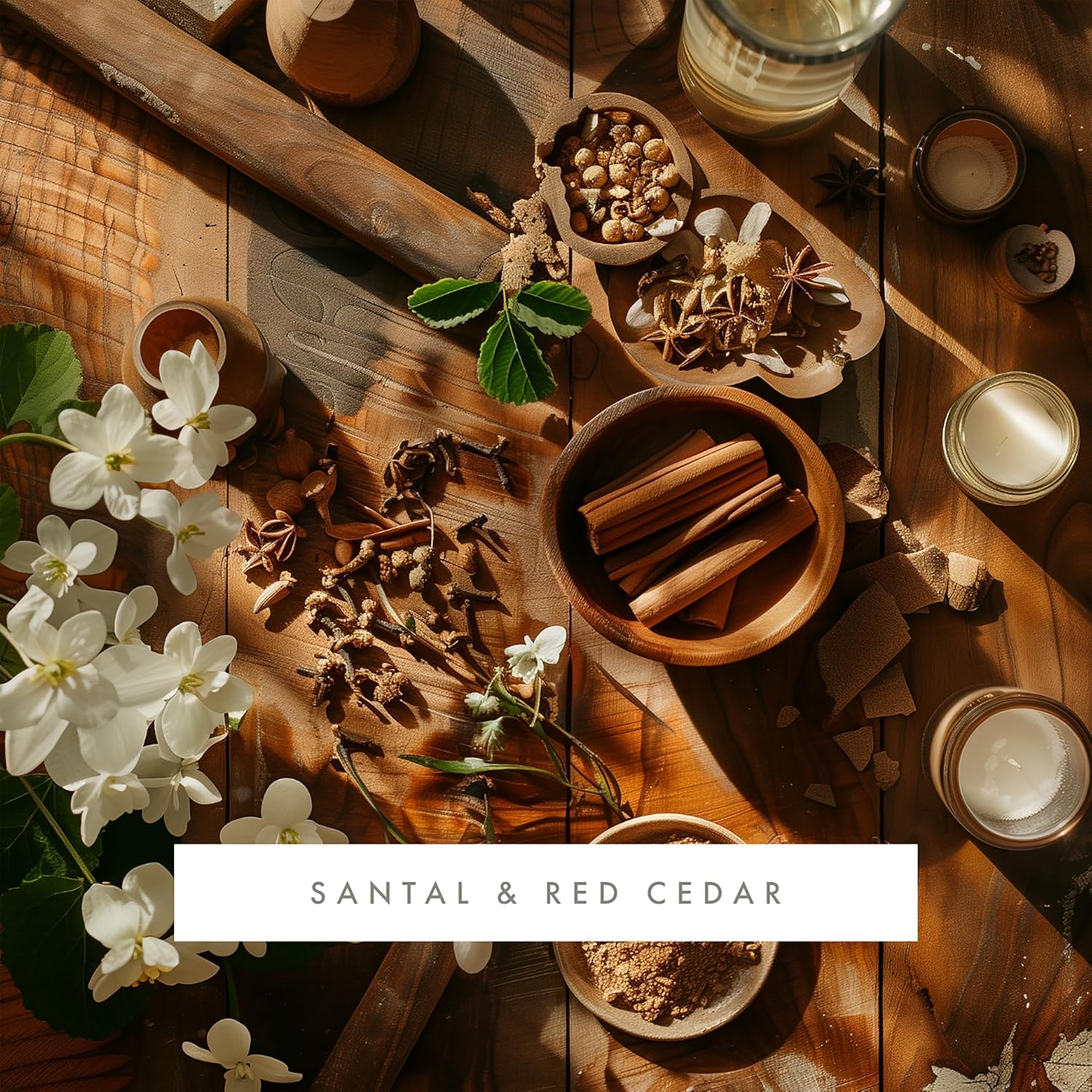 - THE FRAGRANCE: Santal & Red Cedar features notes of violet and iris mingle among fragrant red cedarwood touched with warm cardamom and carrot seed.