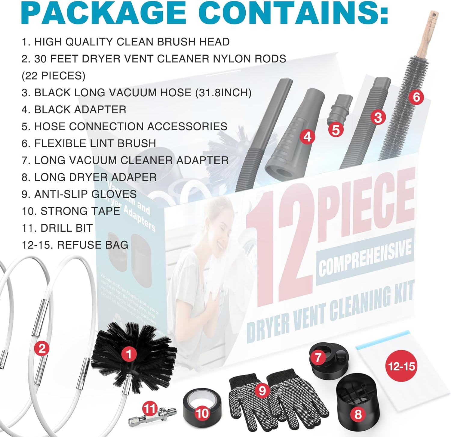 - [Efficient dryer cleaning kit]-Professional dryer vent cleaning tool set can help you deep clean buildup lint in the dryer. Including 30feet vent cleaner set Γ 1, Dryer Lint Vacuum Attachment Γ 1, Long Lint Trap Brush Γ 1, Vacuum Cleaner Adapter x1, Dryer Adapter x1, Drill Bit x 1, Strong Tape(for nylon rod) x1, Anti-slip Gloves x1, Refuse Bag x1
