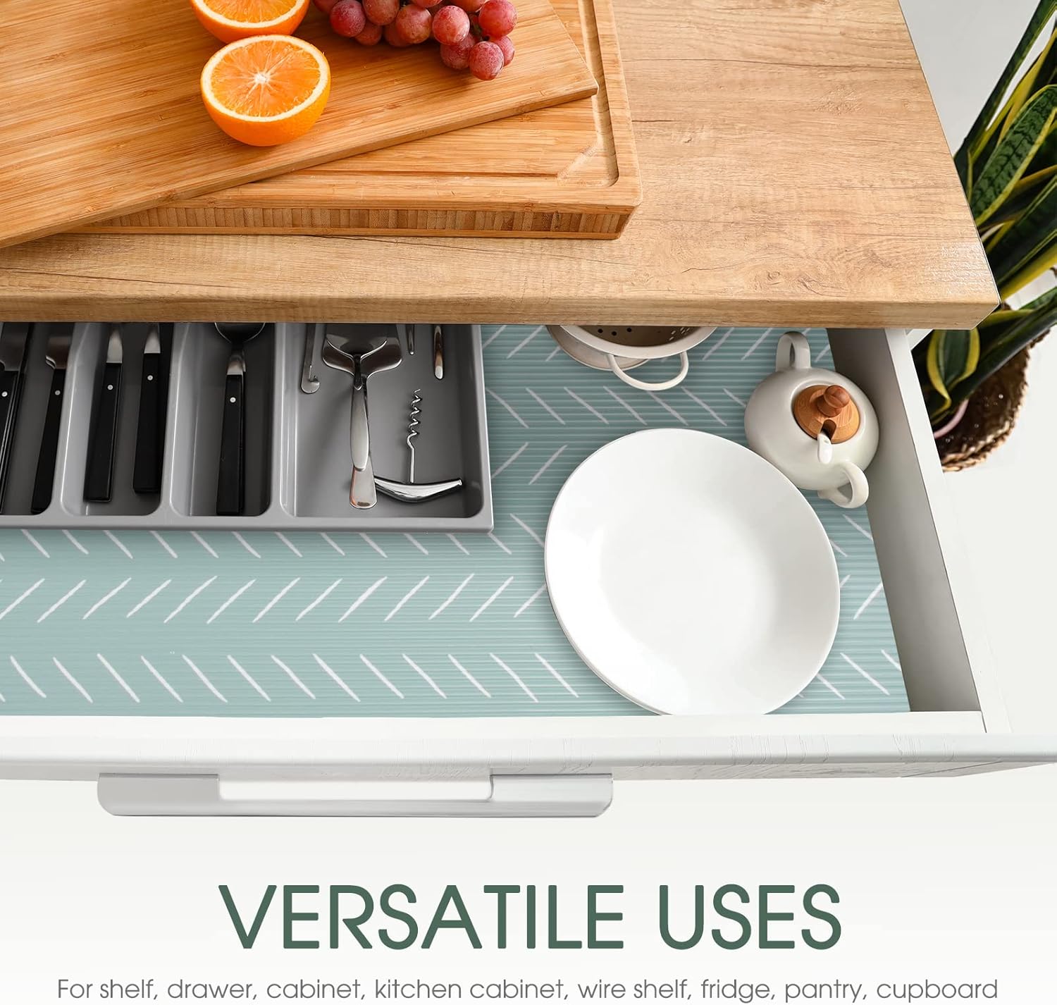 - Premium Cabinet Liner Made of Food-Grade EVA Material: This kitchen, drawer, cabinet, shelf, fridge and general storage shelf liner is made of BPA-free, odor-free, EVA material for your safety. The non-slip design sticker on the bottom of this drawer liners for kitchen allows your kitchen supplies to stay organized, in place and on the shelves, wire rack and pantry
