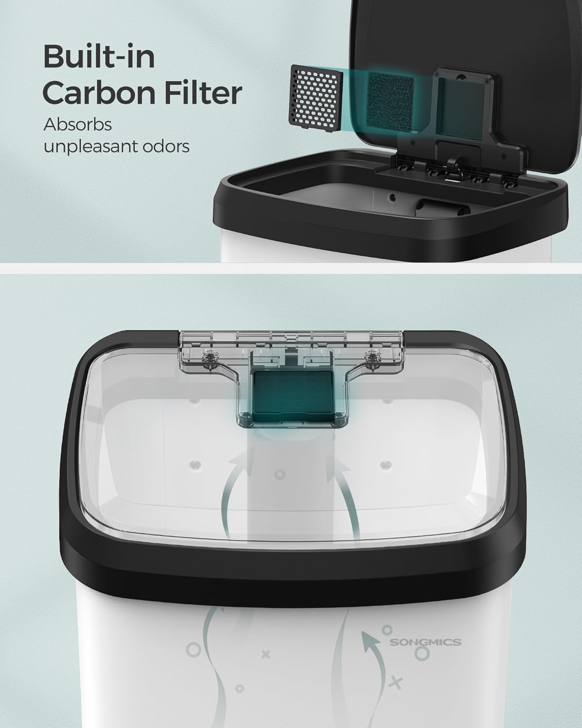 - [Thoughtful Detailing] The carbon filter in the lid helps absorb unpleasant odors, keeping your kitchen smelling fresh. Included are 15 liner bags (16-18 gallons) that perfectly fit this kitchen can