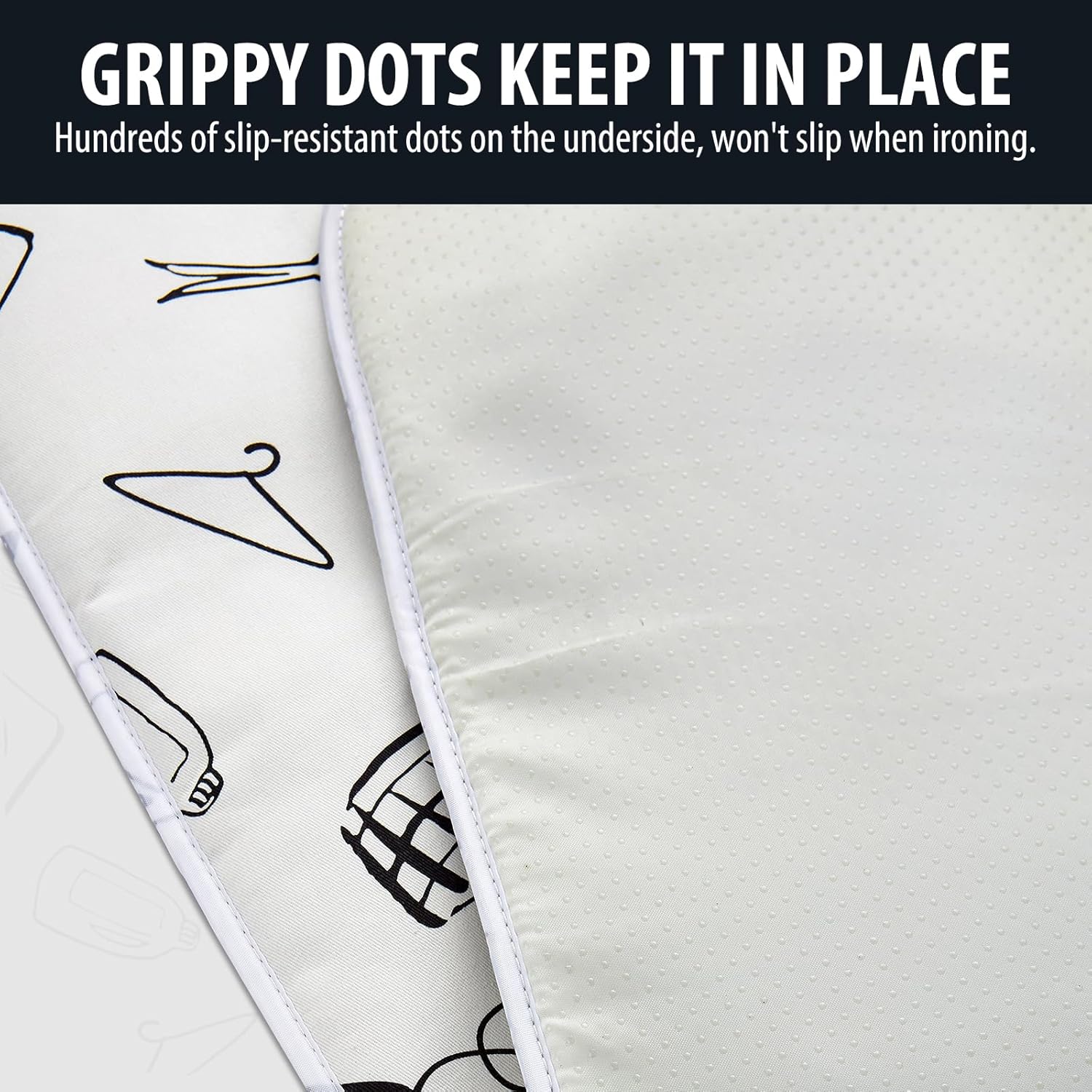 - THICKEN AND ANTI SLIDE: Made of 5 layers thicken material with extra thick padding is scratch proof, waterproof and heat resistant. Protects table or bed from burning as well as allows steam to go through and also holds heat for quick ironing