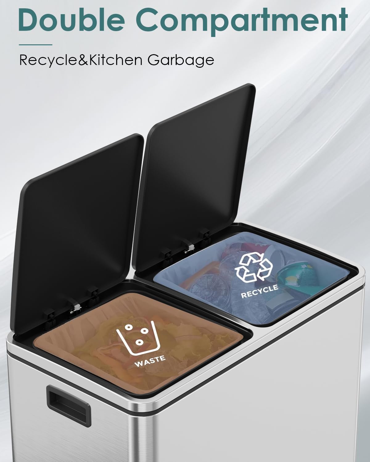 - 2*8 GALLONS COMPARTMENTS: Trash can has two independently compartments for trash and recyclables, making it easy to sort waste.