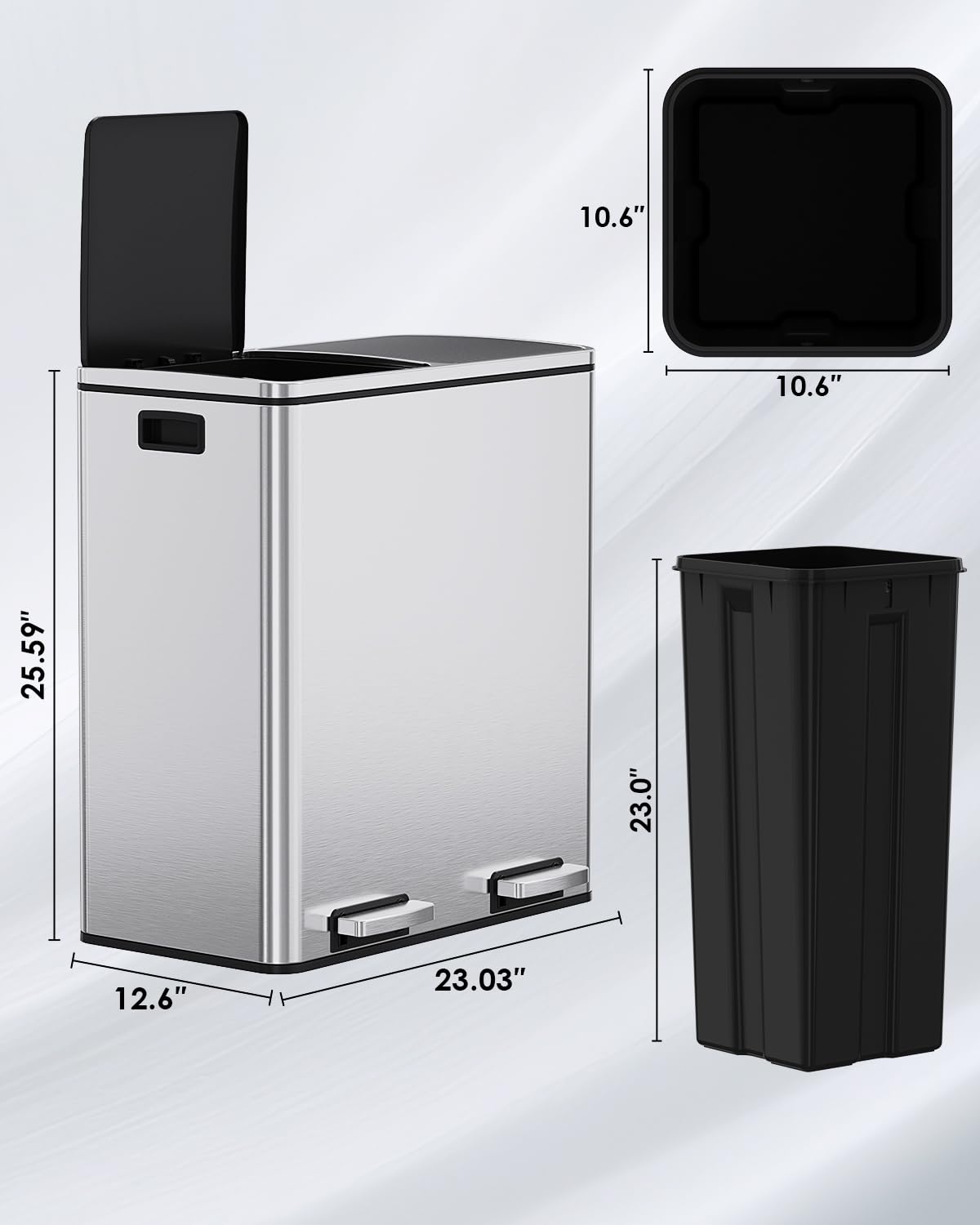 - WIDEN PEDAL&SIDE HANDLES: Dual trash can includes 2 non-slip metal pedals that can open 2 lids individually, free your hands and cleaner. With 2 portable side handles, we can move it easily.