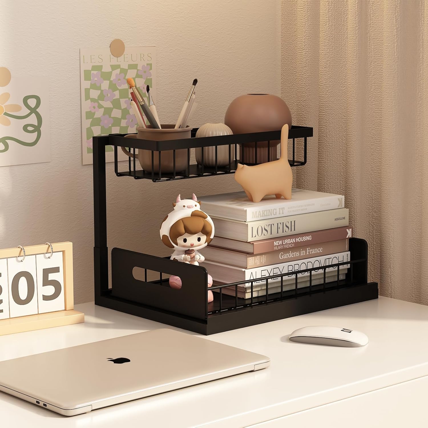 - [Space Saving] Organize the space under your cabinets with this 2-tier under sink storage. This under the sink organizer can solve your under cabinet storage troubles and increase the utilization of limited sink space. With pull out cabinet organizer, you have room for all your stuff, and a slide-out system like this makes it easier to access everything you store under the sink