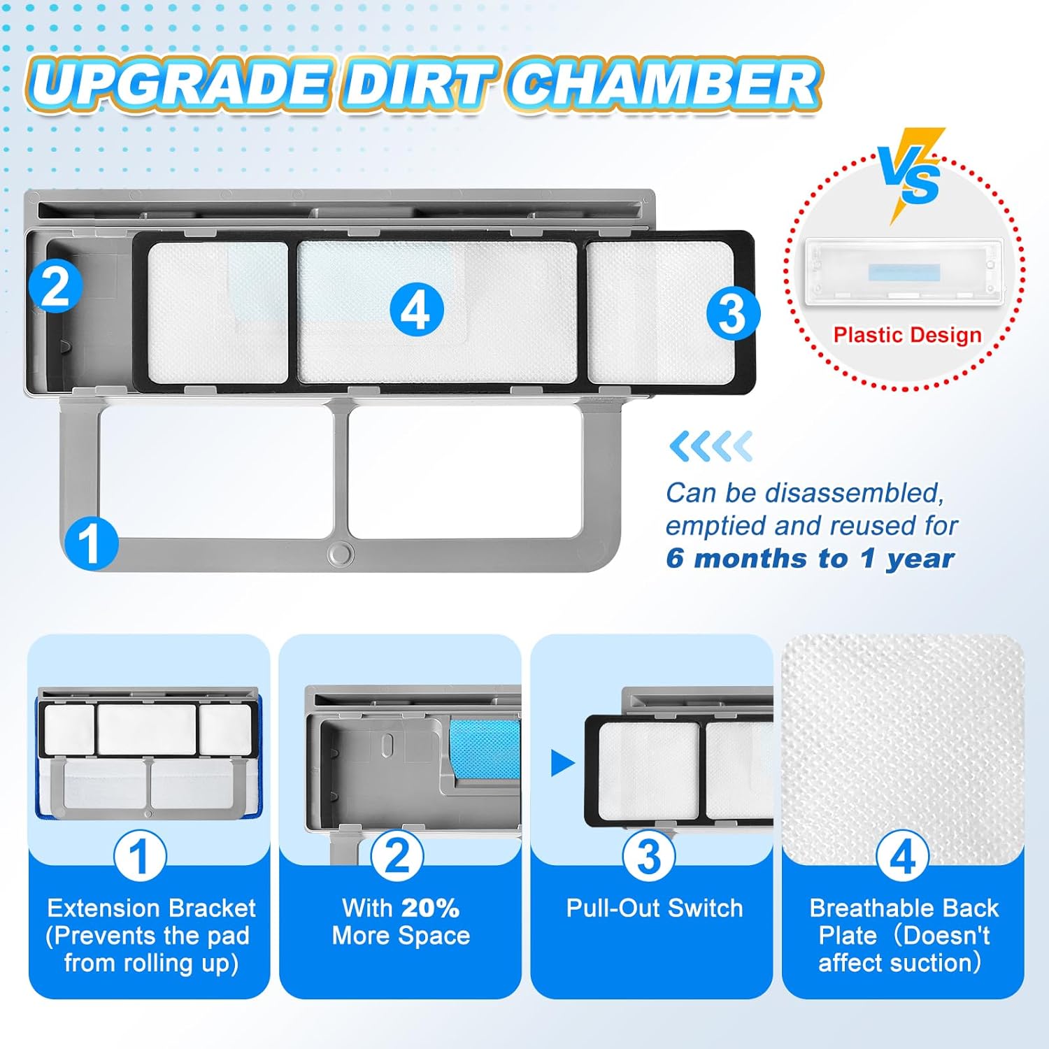 - SIGNIFICANT IMPROVED & TRULY REUSABLE : Compatible with Vac mop pads refills with upgraded dirt chamber has 20% more space to collect more dirt and dust than the original. The frame is more stable, the Velcro on the frame grabs compatible with shark vacmop pads very securely keeping the mop pads refills in place all of the time, made of ABS material, which is more durable and long-lasting than other plastics, you only need to replace the filter and vacuum mop pads refill every 1-3 months