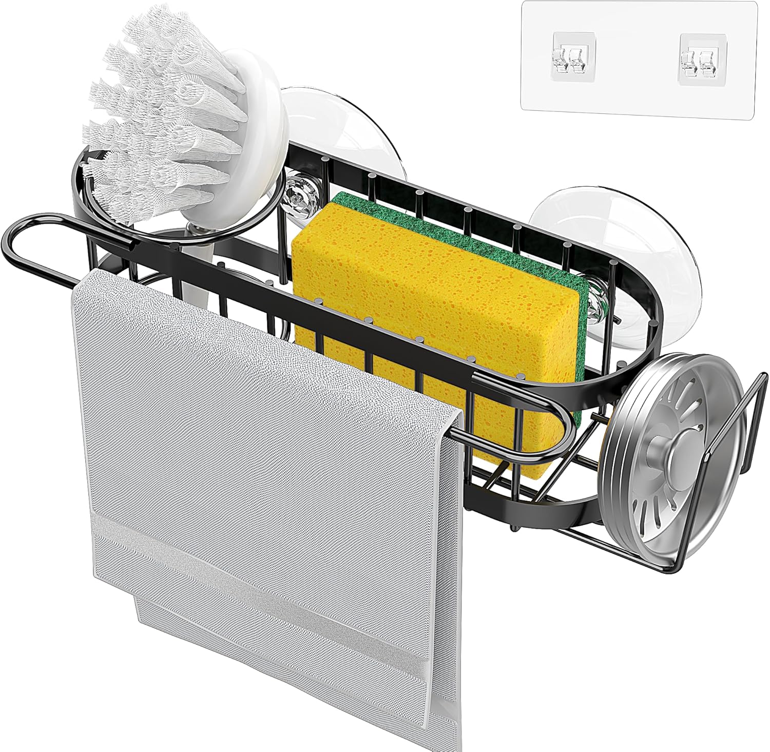 - ăSMALL SHELF LARGE CAPACITYăUnlike the common simple kitchen sponge holder for sink on the market, this kitchen sink rack can be used to store sponges, soap, brushes, towels, sink filters, sink plugs, scrubs and nail brushes, kitchen essentials for new home