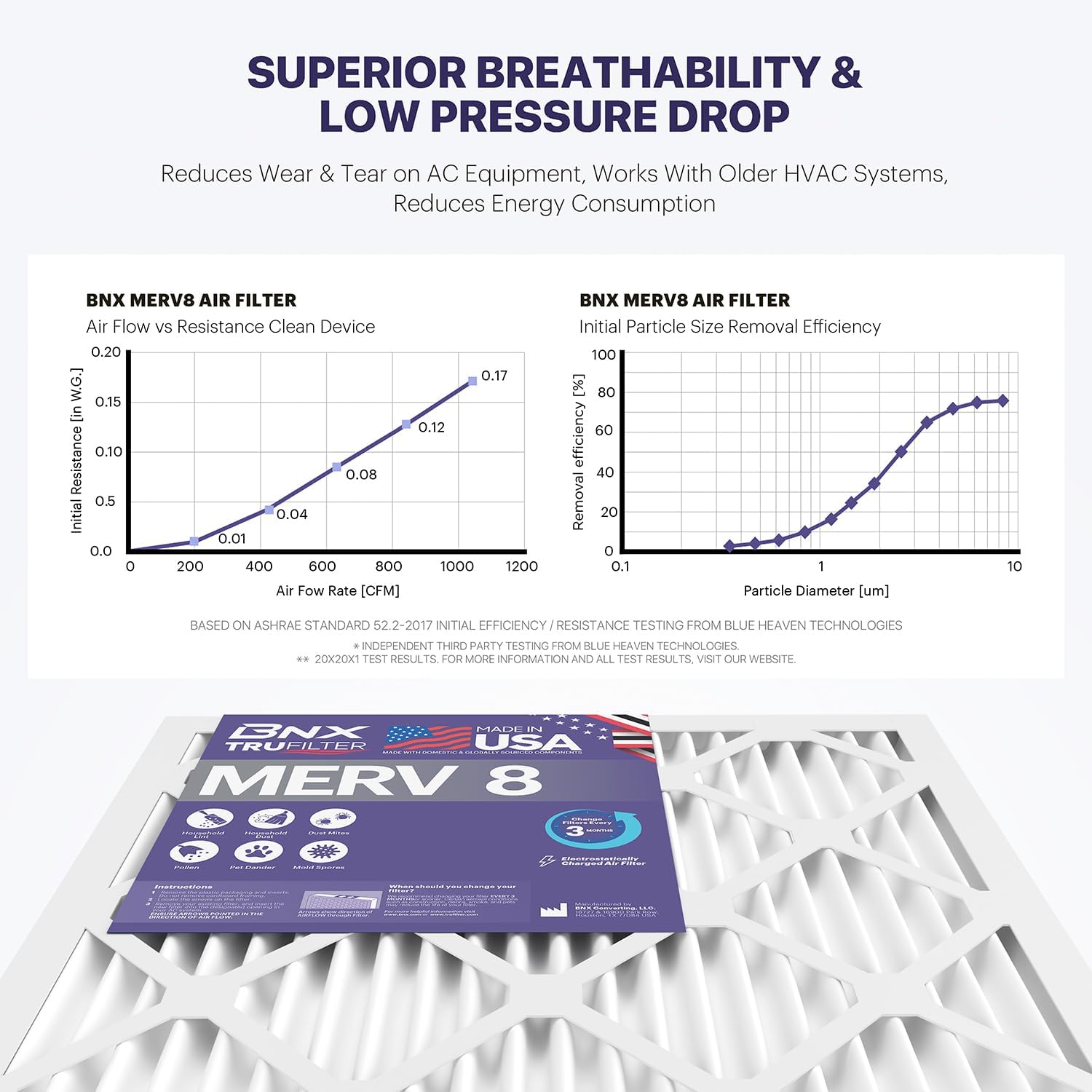 - SUPERIOR PERFORMANCE - The BNX MERV 8 100% synthetic electrostatically charged air filter media outperforms standard fiberglass filters and adopts the latest in electrostatic filtration technology to allow for industry leading superior low air flow resistance while maintaining the highest grade level of filtration.