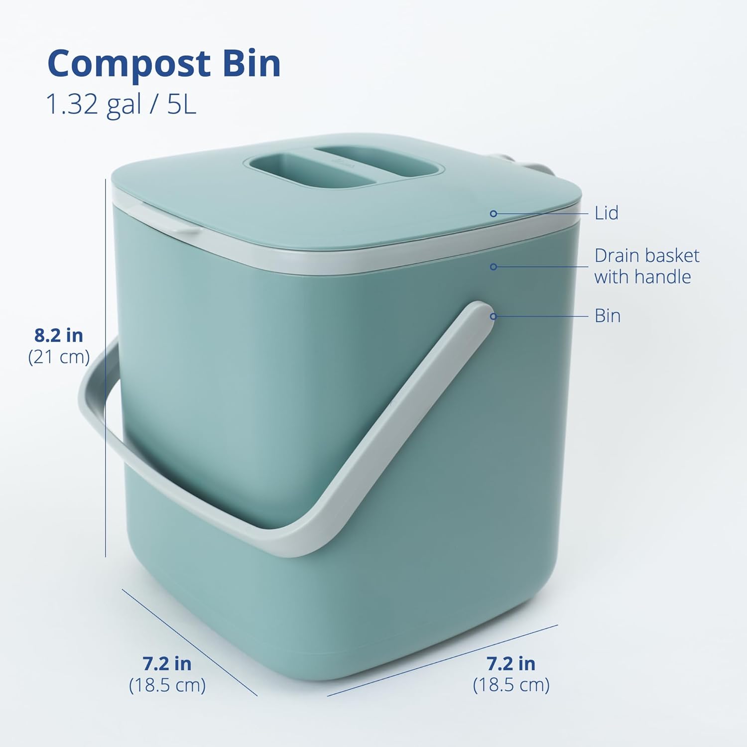 - AVAILABLE IN TWO SIZES - This compost bin is perfect for a 4-person household. It has a capacity of 1.32 gallons or 5 Liters and the outer dimensions measure W7.2 x H8.2 x D7.2 inches.