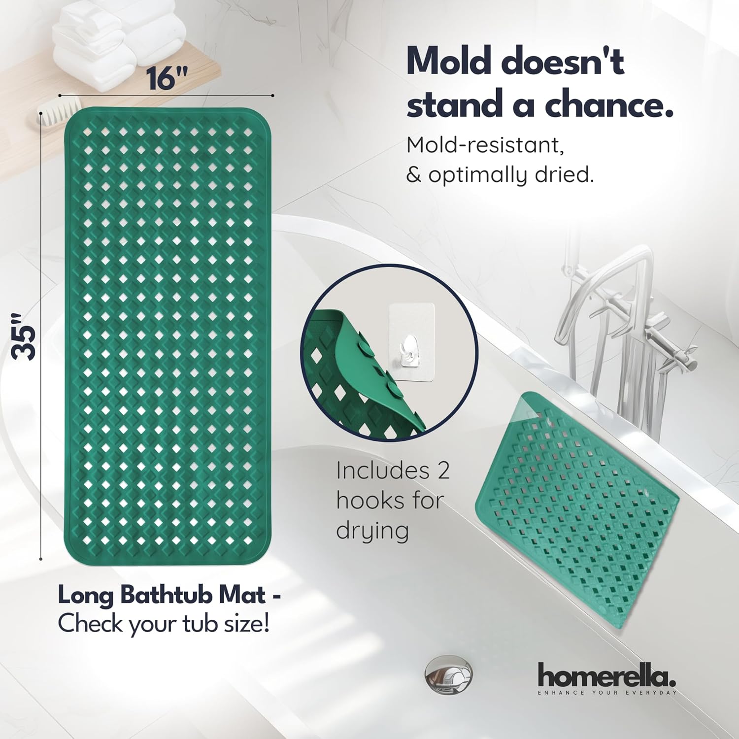 homerella® Bathtub Mat Non Slip 35x16, Incl. Hooks for Drying, Extra Long, 100% BPA Free, Shower Mat Non Slip Anti Mold, Machine Washable, Shower Mats for Inside Shower Mildew Resistant