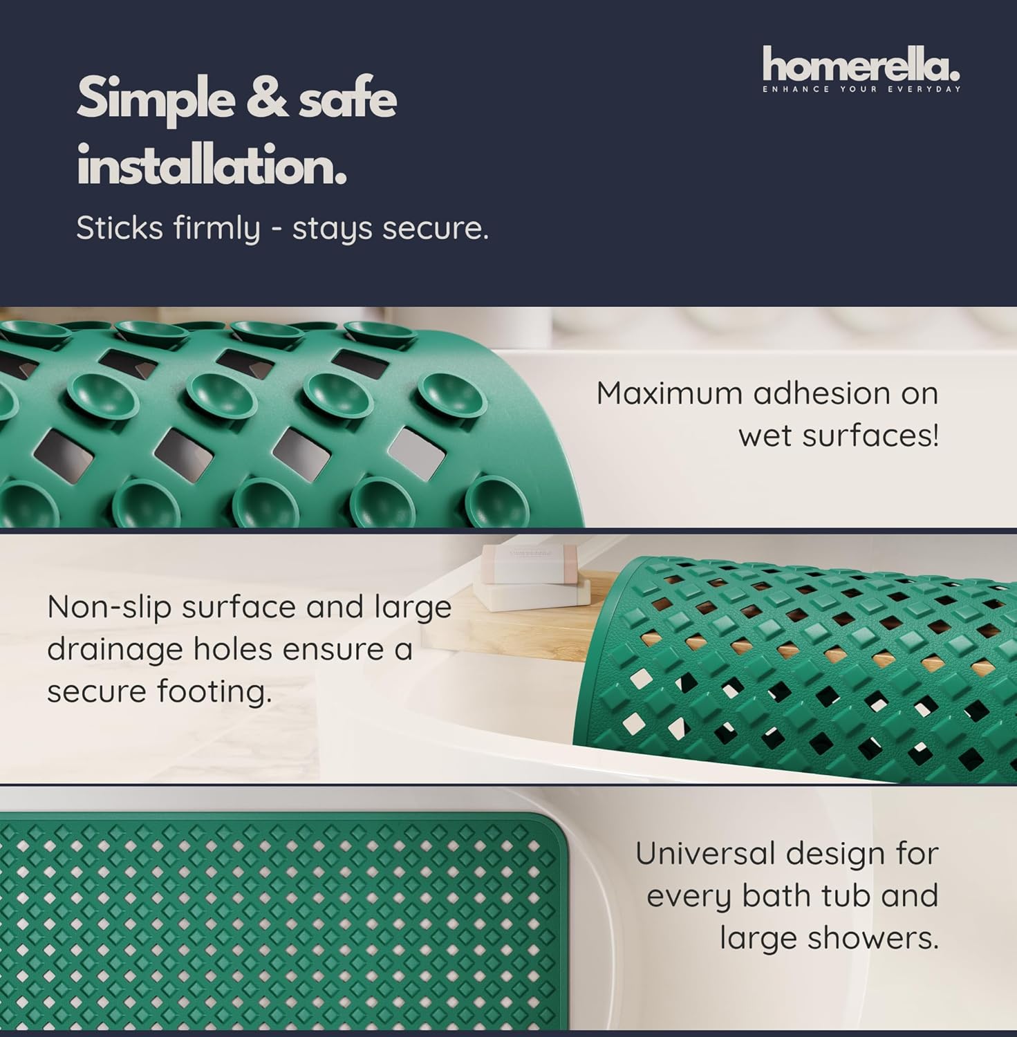 - Incl. 2 Hooks for Drying: Our Special Feature - No more wet anti slip bathtub mat on the edge of the bathtub! Thanks to the 2 self-adhesive hooks the anti slip shower mat can be dried and stored perfectly. They can be removed without leaving any residue.