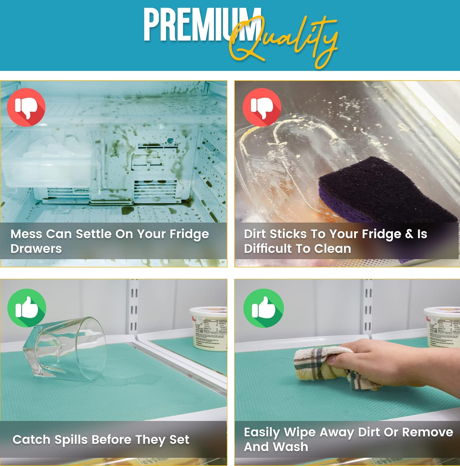 - BRIGHTEN UP YOUR FRIDGE: Our sleek blue colored fridge liners bring a touch of life to your fridge, giving you a refreshing and bright look. Easily organise your foods according to the different colors, making it easy for you to separate your meats and dairies. Each pack comes with 12 waterproof and washable fridge mats measuring 17.7” by 11.4”. Simply combine 2 liners together to fit your fridge shelf if you have a large fridge, or simply use one mat per shelf