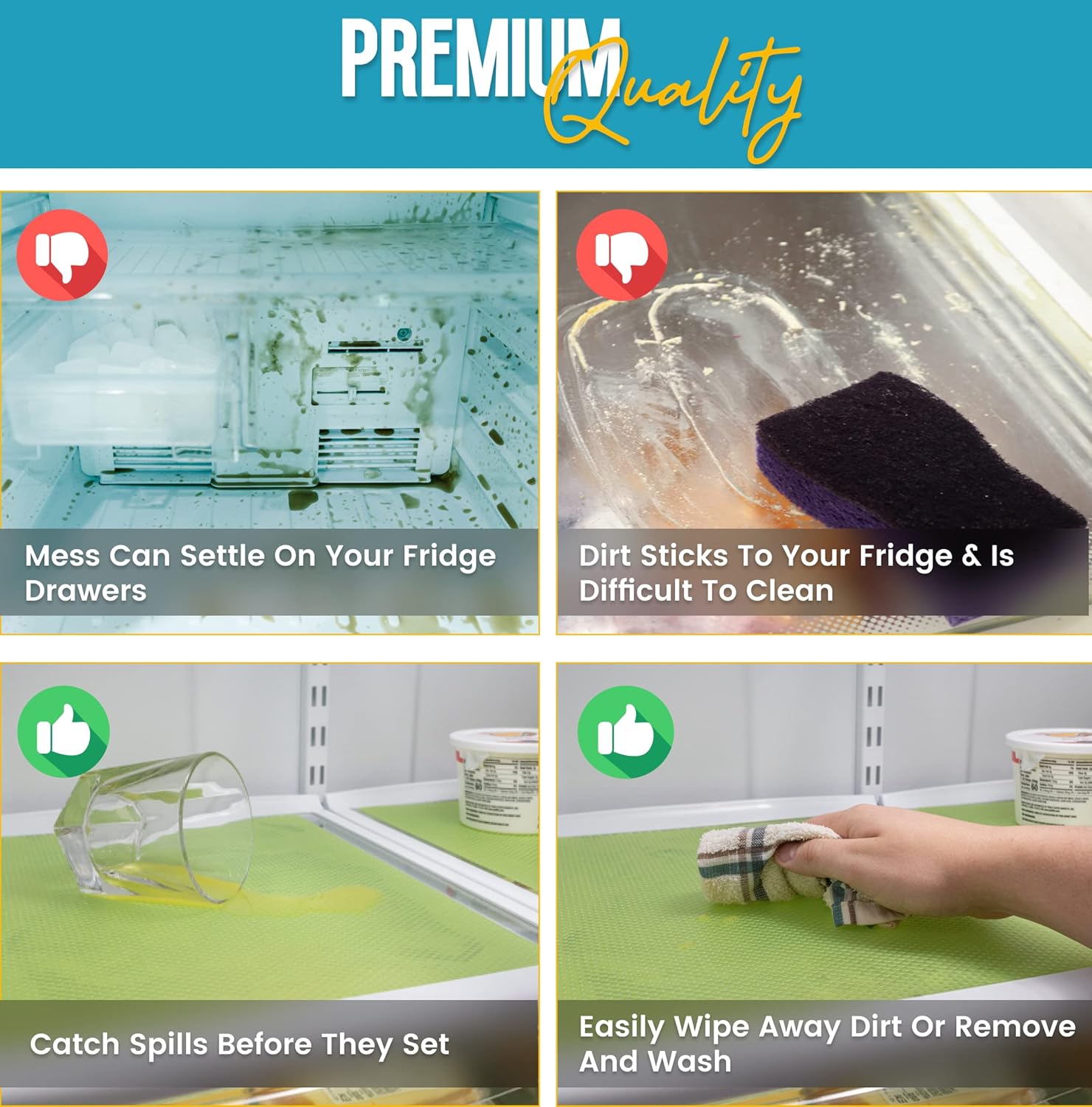 - BRIGHTEN UP YOUR FRIDGE: Our sleek green colored fridge liners bring a touch of life to your fridge, giving you a refreshing and bright look. Easily organise your foods according to the different colors, making it easy for you to separate your meats and dairies. Each pack comes with 12 waterproof and washable fridge mats measuring 17.7” by 11.4”. Simply combine 2 liners together to fit your fridge shelf if you have a large fridge, or simply use one mat per shelf