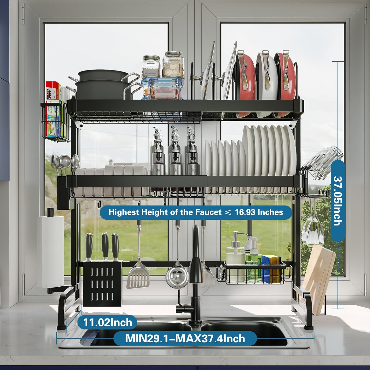 - 2 - Layer Large - Capacity Expandable Design This over - sink dish drying rack features a flexible sizing option, ranging from 25.5'' to 37.6'' in length, with a width of 10.95" and a height of 33.35". It's suitable for faucets with a maximum height of 16.93 inches. Thanks to its expandable design and added double - layer structure, it offers ample storage. The top layer can serve as a shelf for various kitchen items. No need to fret about incorrect sizing. It makes for an excellent gift for friends or family on occasions like housewarmings, Thanksgiving, Christmas, and other holidays.