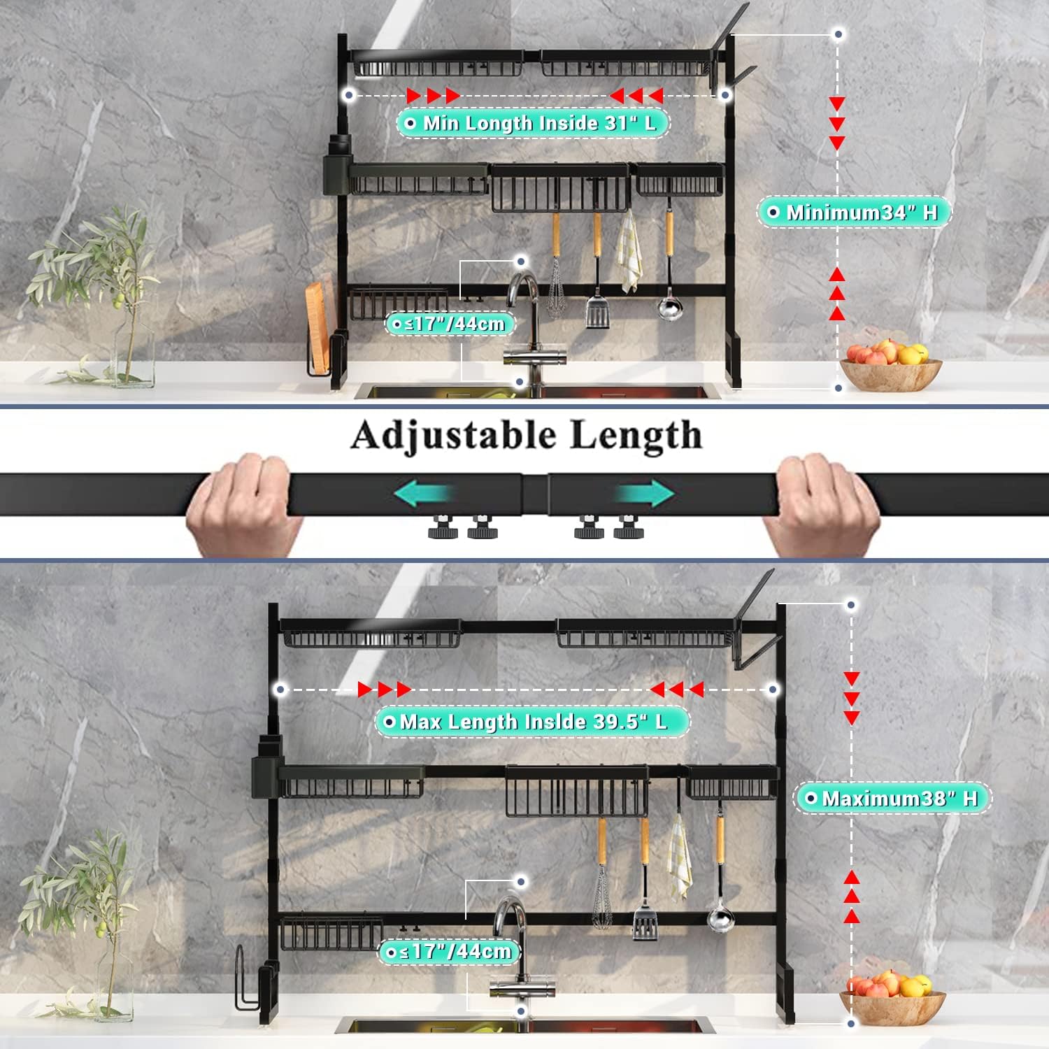 - ăWarningăDimension: 31 - 39.5L x 12W x 34 - 38H (inches). The length of your sink should be â€39.5" and the height of the faucet should be †17". The Height can be adjusted from 34" to 38". So if the area above your sink is too small, please choose our 2 tier over sink dish rack.
