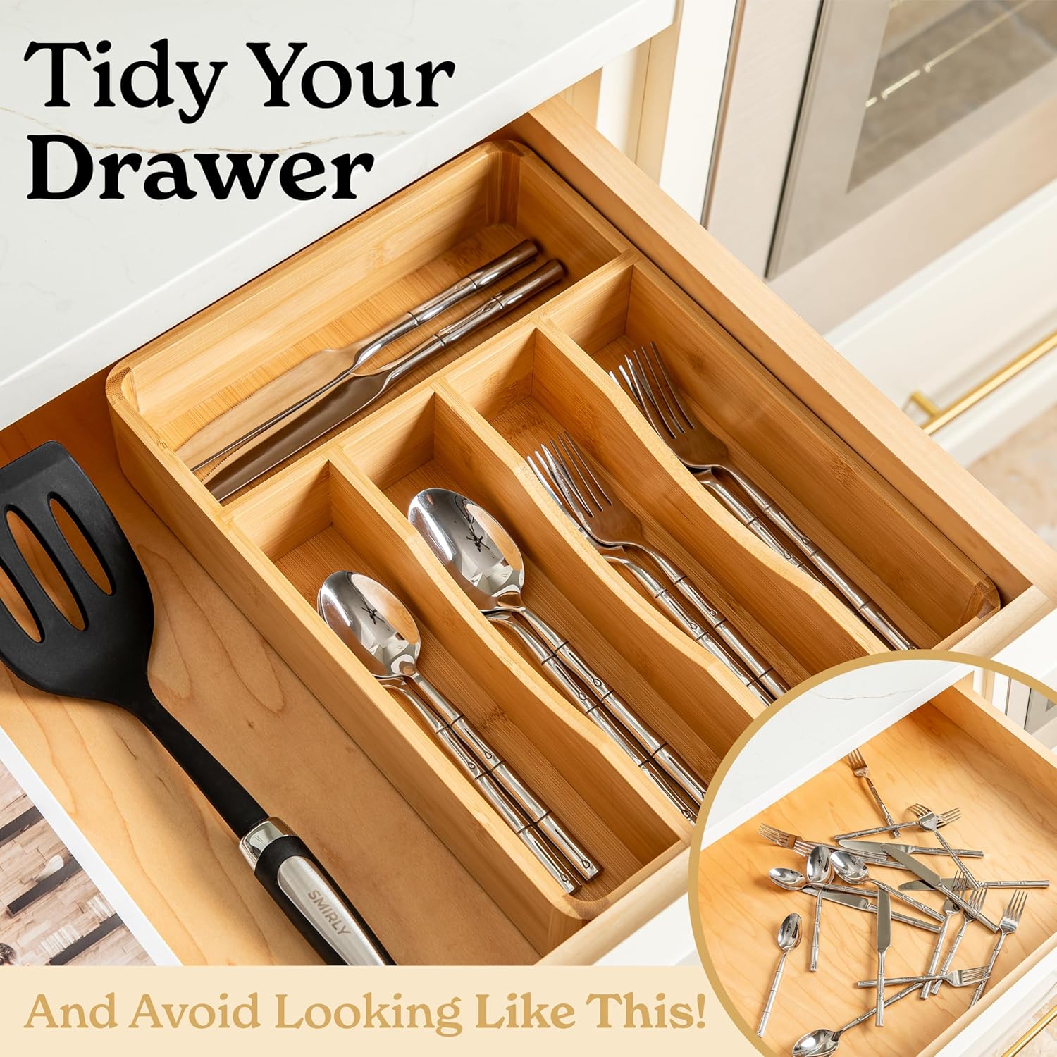 SMIRLY Silverware Drawer Organizer – Bamboo Kitchen Drawer Organizer, Adjustable Utensil Holder and Cutlery Tray, Drawer Dividers for Flatware and Kitchen Utensils