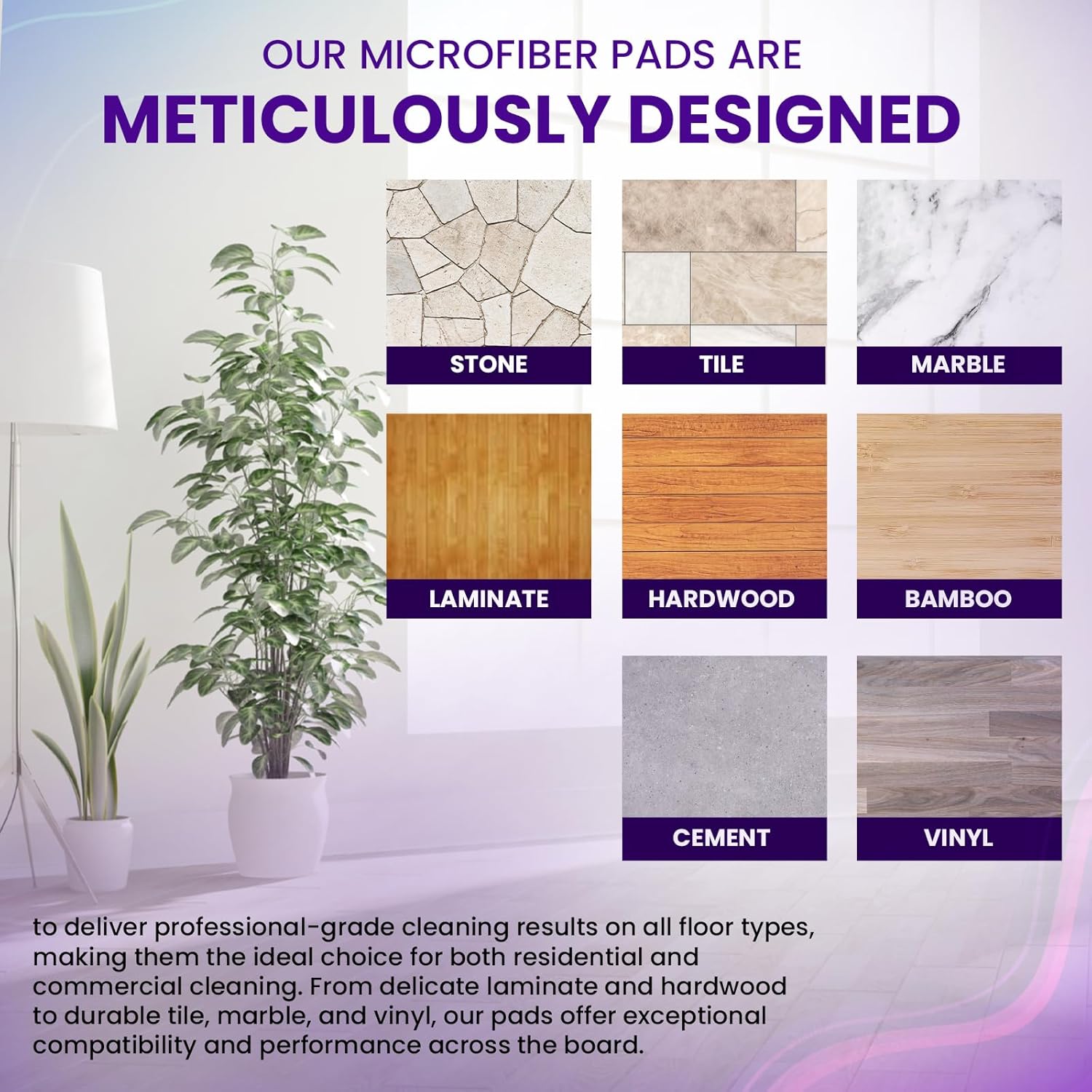 - 【Optimal Compatibility with All Floor Surfaces】 Our microfiber pads are meticulously designed to deliver professional-grade cleaning results on all floor types, making them the ideal choice for both residential and commercial cleaning. From delicate laminate and hardwood to durable tile, marble, and vinyl, our pads offer exceptional compatibility and performance across the board.