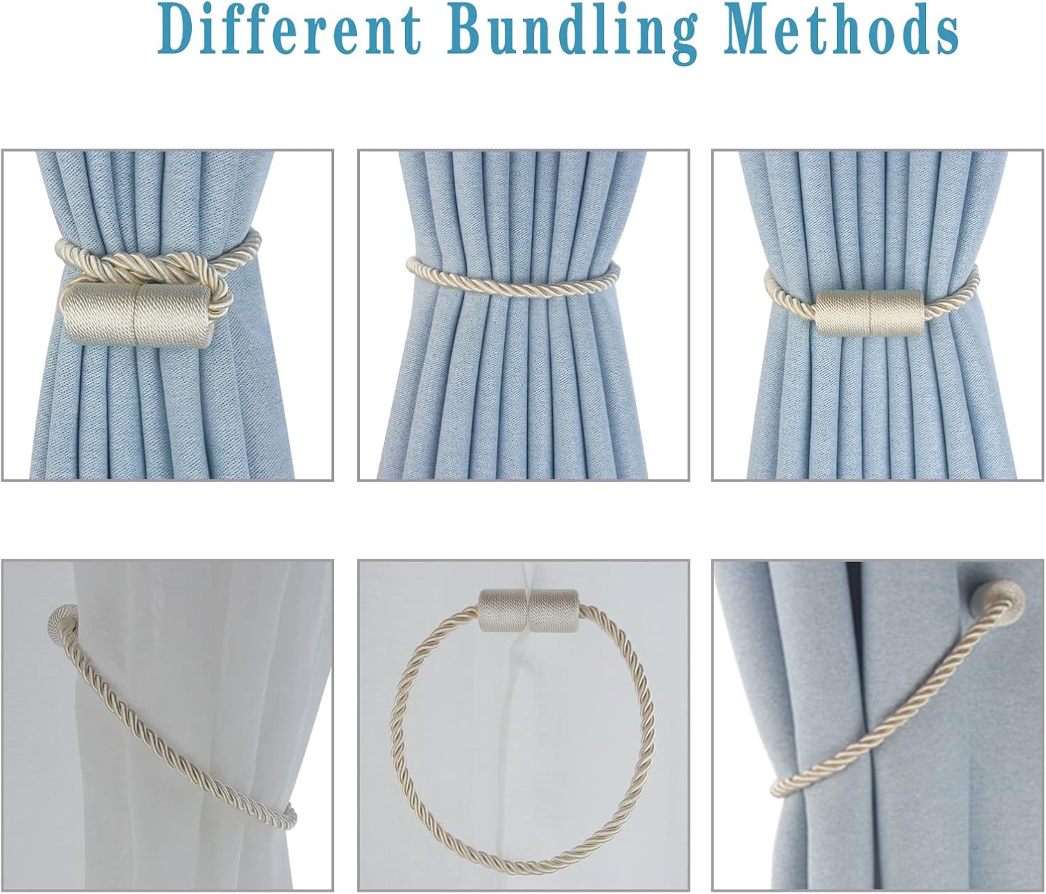 - High-Quality Materials- Magnetic curtain tie backs use an upgraded version of nickel-plated magnets, which are strong and smooth. The brightly colored twisted woven โtexture rope is hand-woven with premium polyester materials. very soft and good feeling. Beige/Gold/Black/White/Grey/Khaki/Coffee/Blue -Eight colors to choose from