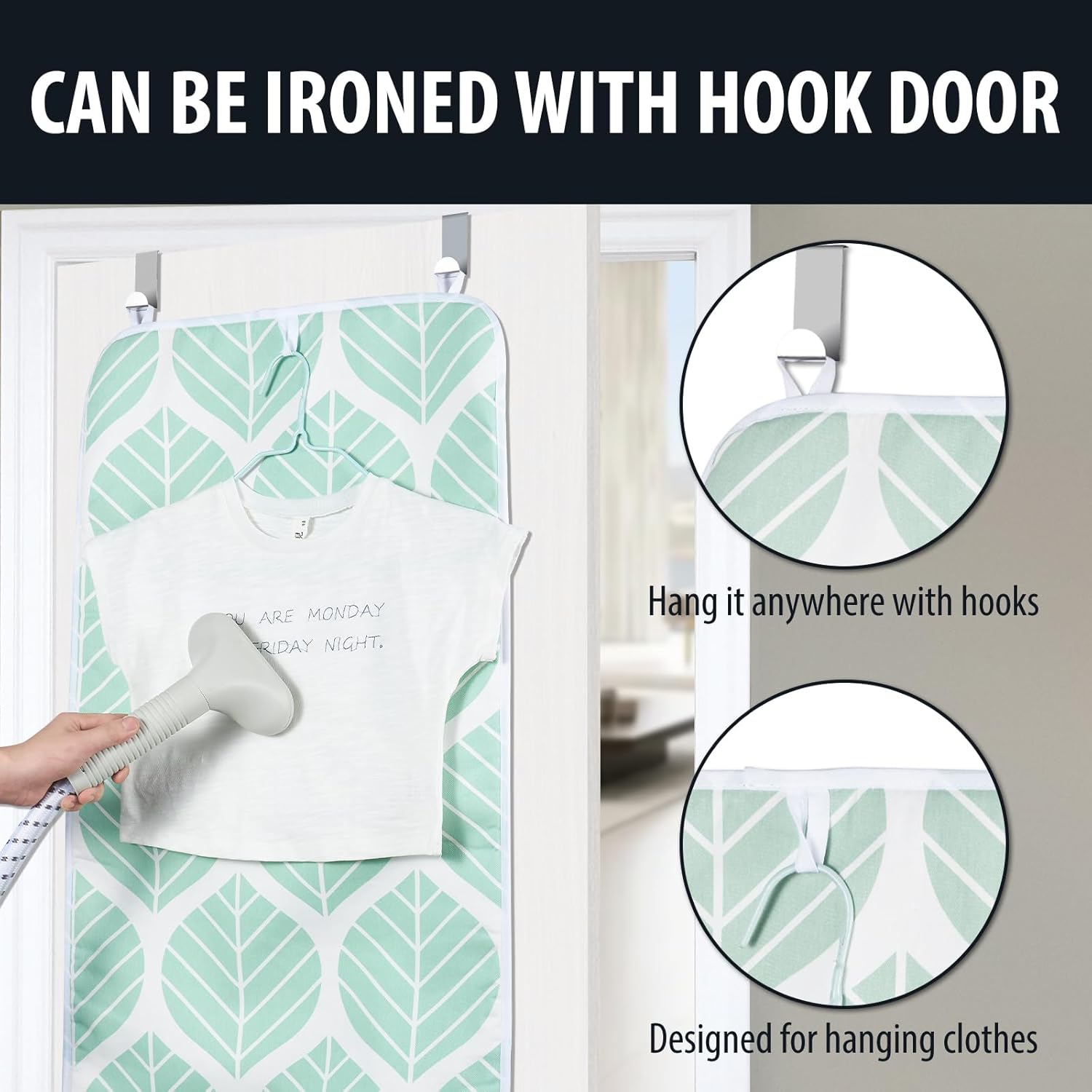 - HANGING IRONING DESIGN: There has three hanging holes on this mat, two for hanging on the door or other places. The middle one is for hanging clothes. Can be used as a over the door ironing board. You are not limited on the table top for ironing. This item is good partner for steam iron. Two hooks are included